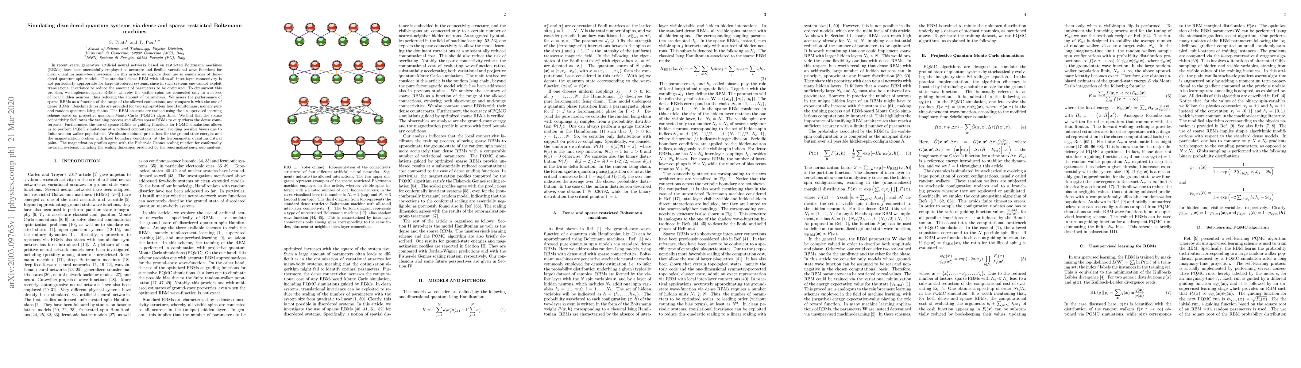 This paper investigates the use of sparse restricted Boltzmann machines (RBMs) for simulating disordered quantum spin models, comparing their performance to dense RBMs. The sparse RBMs, with local connectivity, reduce parameters and facilitate training, leading to better performance and lower computational costs in simulations of quantum Ising chains.