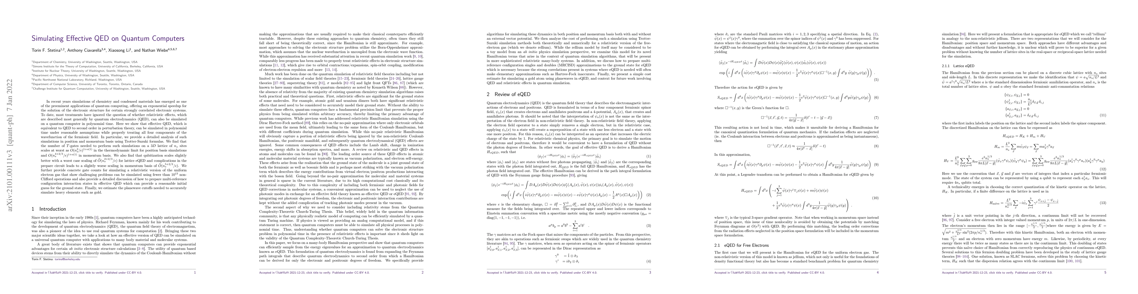 This research demonstrates that effective Quantum Electrodynamics (QED), a relativistic effect description, can be simulated on quantum computers in polynomial time, treating all fermionic field components. The method uses Trotter-Suzuki formulas and qubitization, with gate counts estimated for simulating a relativistic electron gas. The study also discusses multi-reference configuration preparation in effective QED and planewave cutoff estimation for heavy elements like gold.
