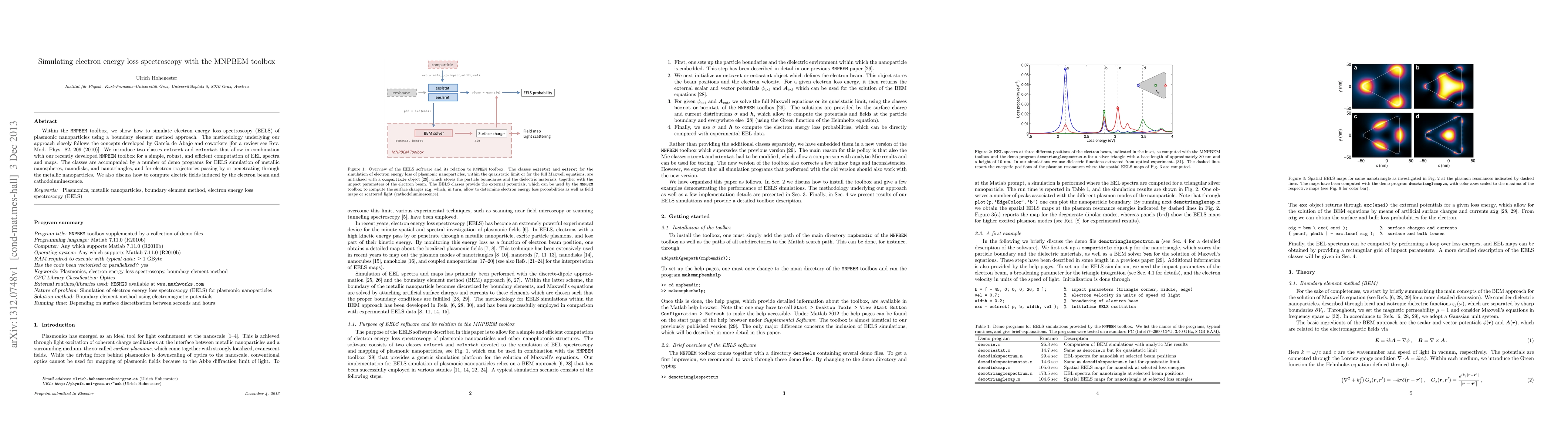 This paper presents a simulation method for electron energy loss spectroscopy (EELS) of plasmonic nanoparticles using the MNPBEM toolbox, based on boundary element methods. It introduces two Matlab classes for efficient computation of EEL spectra and maps, with demo programs for various nanoparticle shapes and electron trajectories.