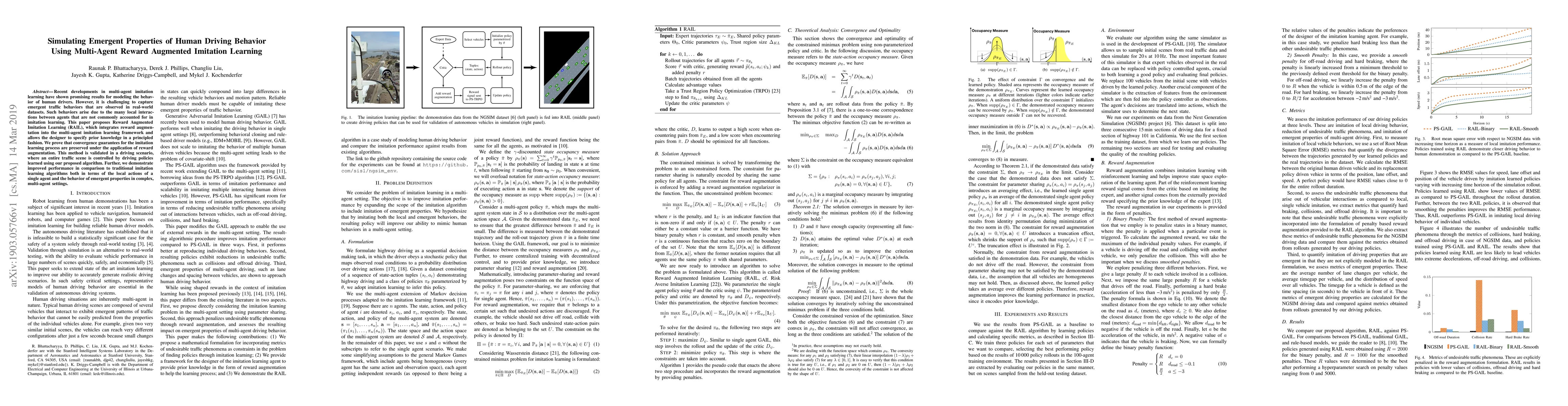 This paper proposes Reward Augmented Imitation Learning (RAIL) to simulate emergent properties of human driving behavior in multi-agent systems. RAIL integrates reward augmentation to capture local interactions, preserving convergence guarantees, and demonstrates improved performance over traditional imitation learning in complex traffic scenarios.