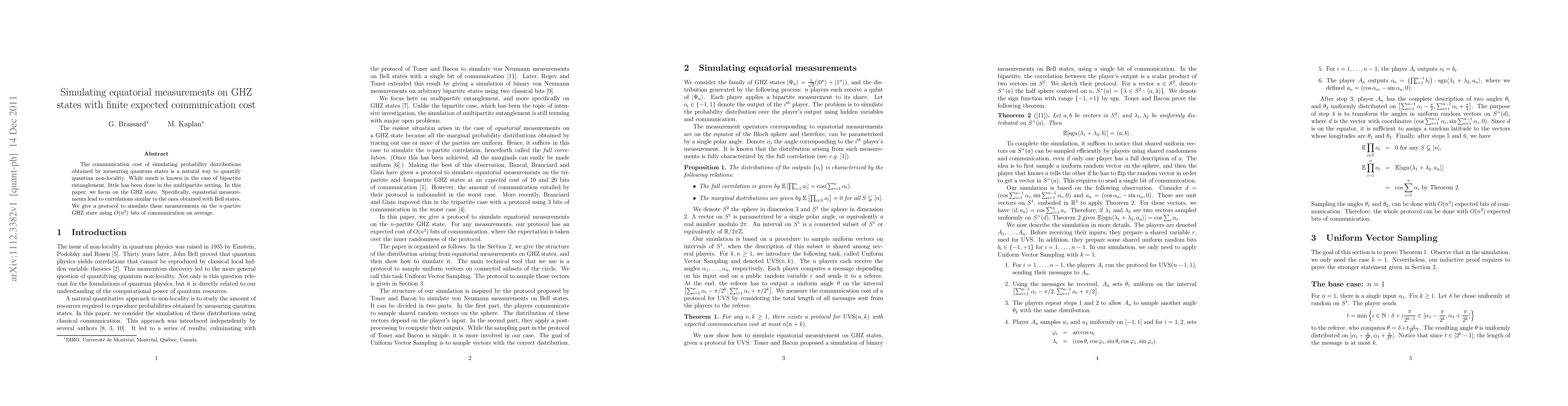 This paper proposes a protocol to simulate equatorial measurements on GHZ states, quantifying quantum non-locality with an expected communication cost of O(n^2) bits. It addresses the gap in multipartite entanglement research beyond bipartite systems.