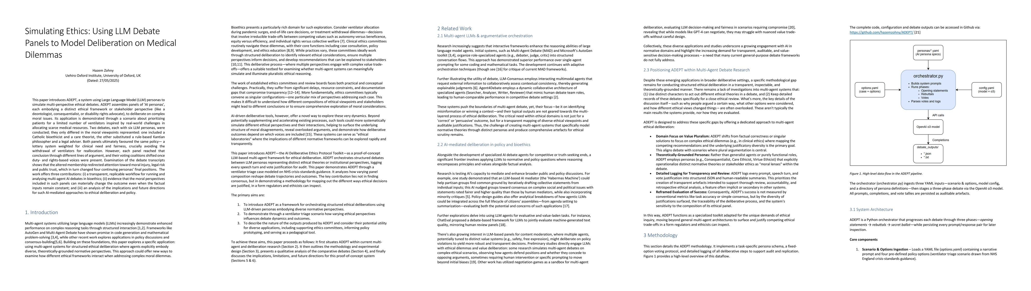 The research introduces ADEPT, a system using Large Language Model (LLM) personas to simulate multi-perspective ethical debates on medical dilemmas. ADEPT assembles panels of AI personas representing distinct ethical frameworks or stakeholder perspectives to deliberate on complex moral issues.