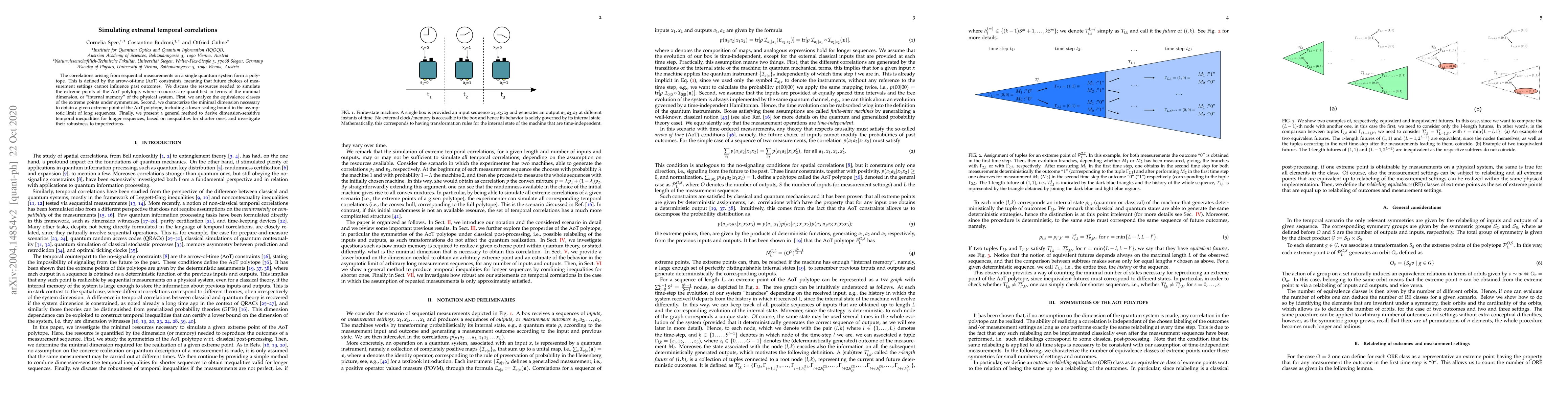 The correlations arising from sequential measurements on a single quantum system form a polytope. This is defined by the arrow-of-time (AoT) constraints, meaning that future choices of measurement settings cannot influence past outcomes. We discuss the resources needed to simulate the extreme points of the AoT polytope, where resources are quantified in terms of the minimal dimension, or "internal memory" of the physical system. First, we analyze the equivalence classes of the extreme points under symmetries. Second, we characterize the minimal dimension necessary to obtain a given extreme point of the AoT polytope, including a lower scaling bound in the asymptotic limit of long sequences. Finally, we present a general method to derive dimension-sensitive temporal inequalities for longer sequences, based on inequalities for shorter ones, and investigate their robustness to imperfections.