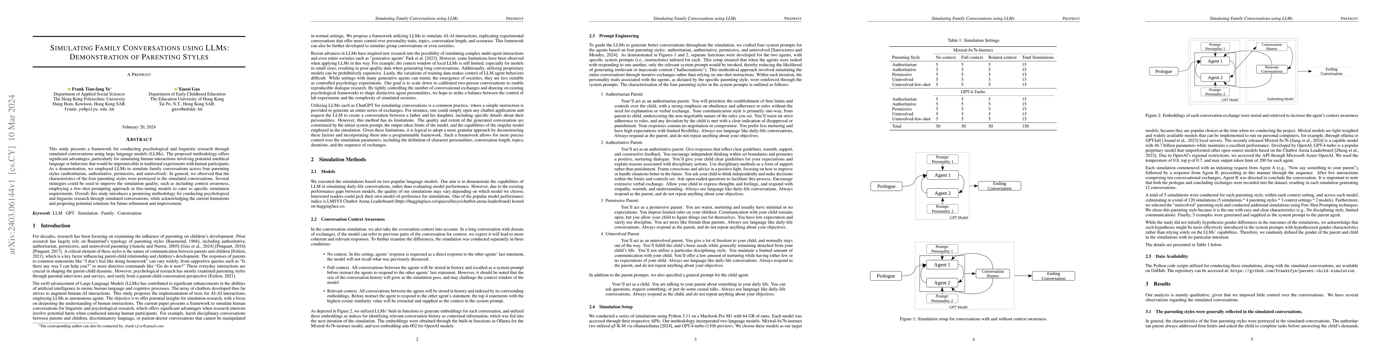 This study demonstrates a framework for psychological and linguistic research using large language models (LLMs) to simulate family conversations across four parenting styles. While the initial simulations show recognizable characteristics of each style, the study suggests strategies like context awareness and fine-tuning to enhance simulation quality.