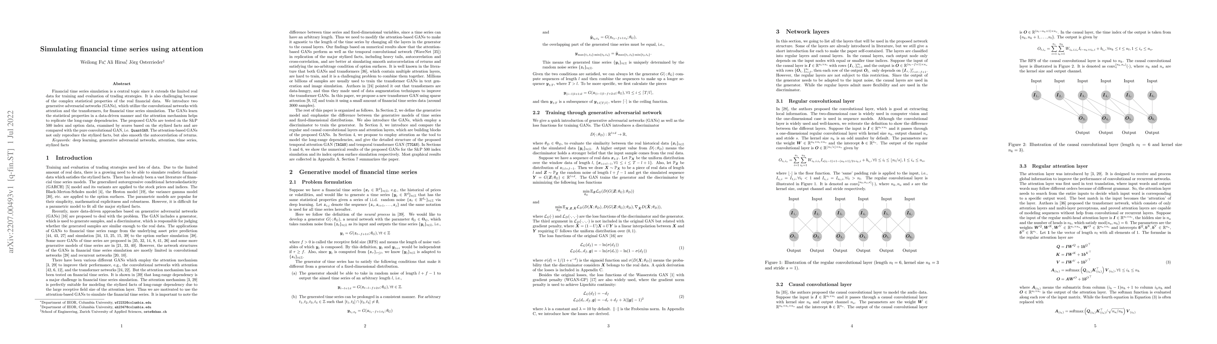 Financial time series simulation is a central topic since it extends the limited real data for training and evaluation of trading strategies. It is also challenging because of the complex statistical properties of the real financial data. We introduce two generative adversarial networks (GANs), which utilize the convolutional networks with attention and the transformers, for financial time series simulation. The GANs learn the statistical properties in a data-driven manner and the attention mechanism helps to replicate the long-range dependencies. The proposed GANs are tested on the S&P 500 index and option data, examined by scores based on the stylized facts and are compared with the pure convolutional GAN, i.e. QuantGAN. The attention-based GANs not only reproduce the stylized facts, but also smooth the autocorrelation of returns.