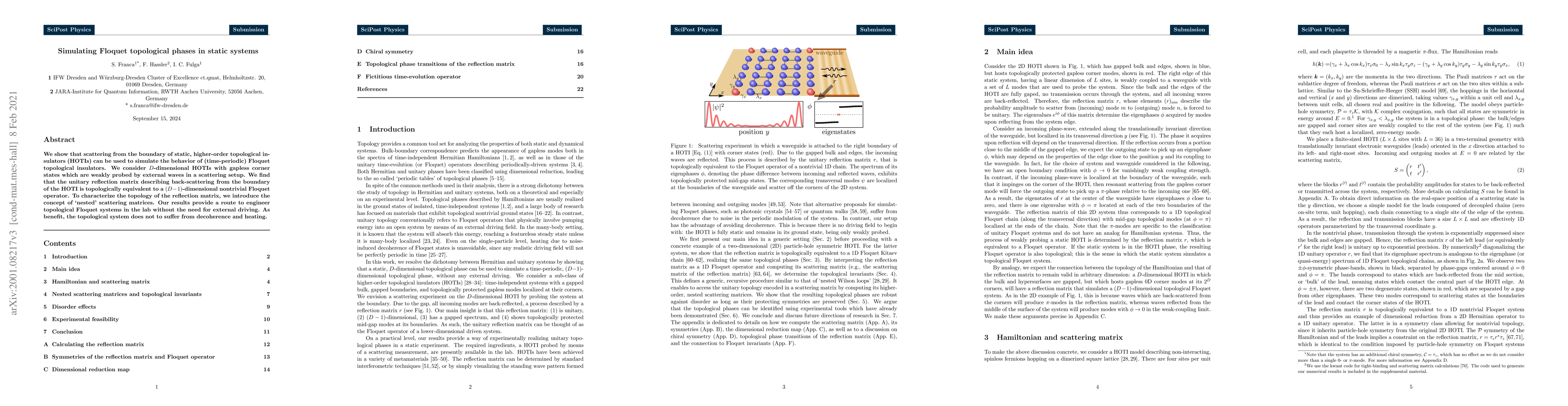 We show that scattering from the boundary of static, higher-order topological insulators (HOTIs) can be used to simulate the behavior of (time-periodic) Floquet topological insulators. We consider D-dimensional HOTIs with gapless corner states which are weakly probed by external waves in a scattering setup. We find that the unitary reflection matrix describing back-scattering from the boundary of the HOTI is topologically equivalent to a (D-1)-dimensional nontrivial Floquet operator. To characterize the topology of the reflection matrix, we introduce the concept of `nested' scattering matrices. Our results provide a route to engineer topological Floquet systems in the lab without the need for external driving. As benefit, the topological system does not to suffer from decoherence and heating.