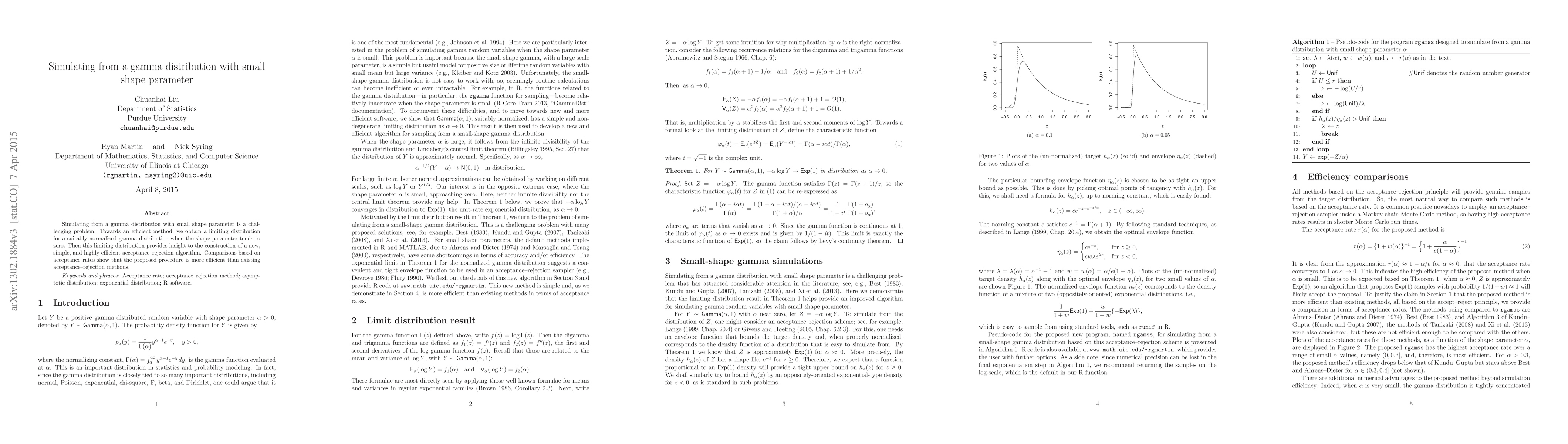 This paper proposes an efficient acceptance-rejection algorithm for simulating from a gamma distribution with small shape parameters, leveraging a limiting distribution as the shape parameter approaches zero. The new method outperforms existing techniques based on comparative acceptance rates.
