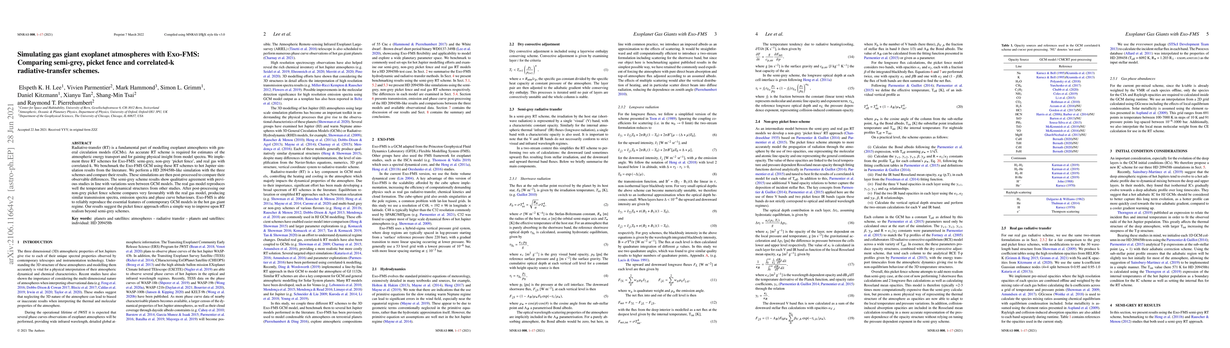 Researchers used Exo-FMS to compare three radiative-transfer schemes for simulating gas giant exoplanet atmospheres, finding that a new picket fence scheme offers improved realism over semi-grey models with similar performance to real gas models.