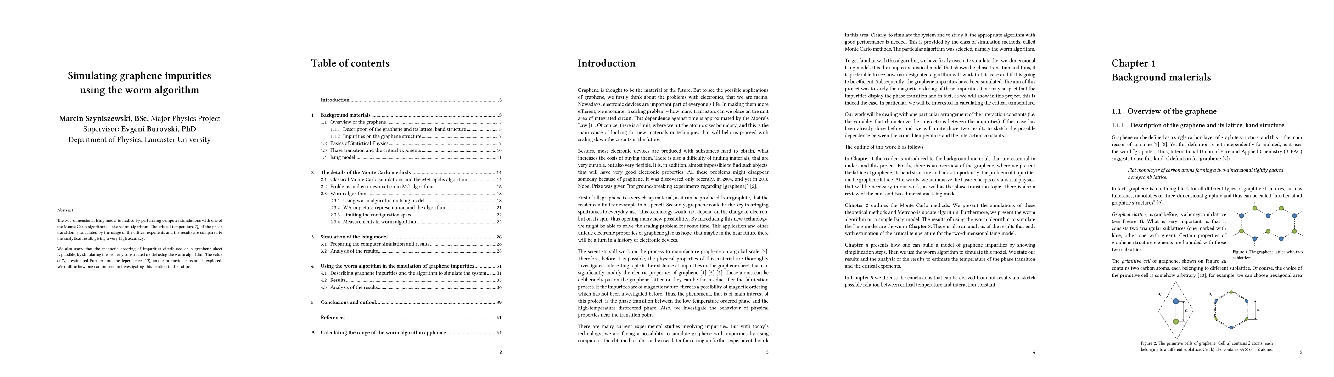 The two-dimensional Ising model is studied by performing computer simulations with one of the Monte Carlo algorithms - the worm algorithm. The critical temperature T_C of the phase transition is calculated by the usage of the critical exponents and the results are compared to the analytical result, giving a very high accuracy. We also show that the magnetic ordering of impurities distributed on a graphene sheet is possible, by simulating the properly constructed model using the worm algorithm. The value of T_C is estimated. Furthermore, the dependence of T_C on the interaction constants is explored. We outline how one can proceed in investigating this relation in the future.