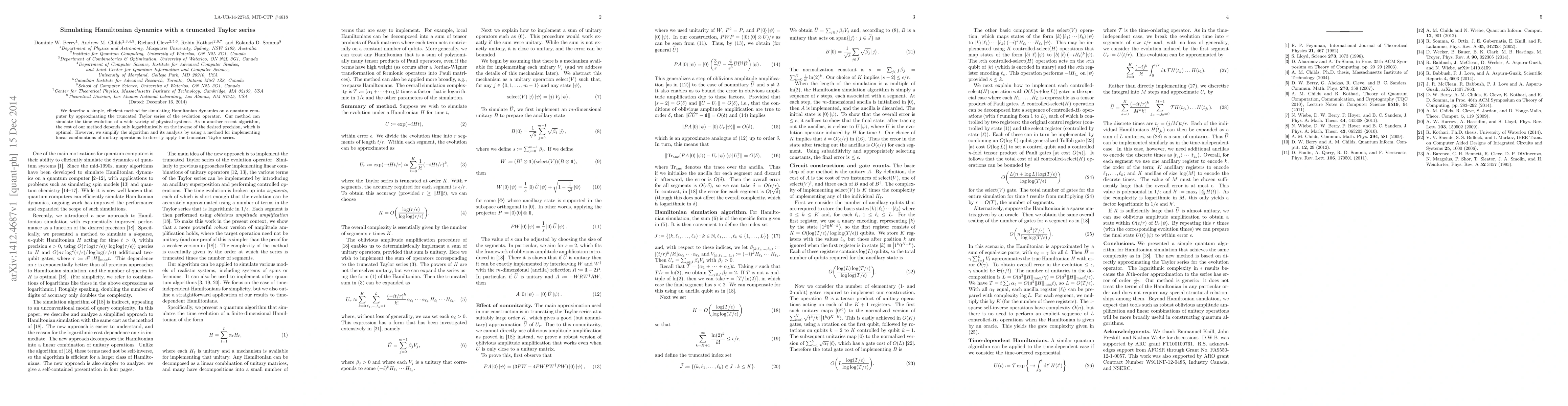This paper presents a simplified, efficient algorithm for simulating Hamiltonian dynamics on a quantum computer using a truncated Taylor series approximation. The method optimally scales logarithmically with precision and leverages linear combinations of unitary operations for implementation.