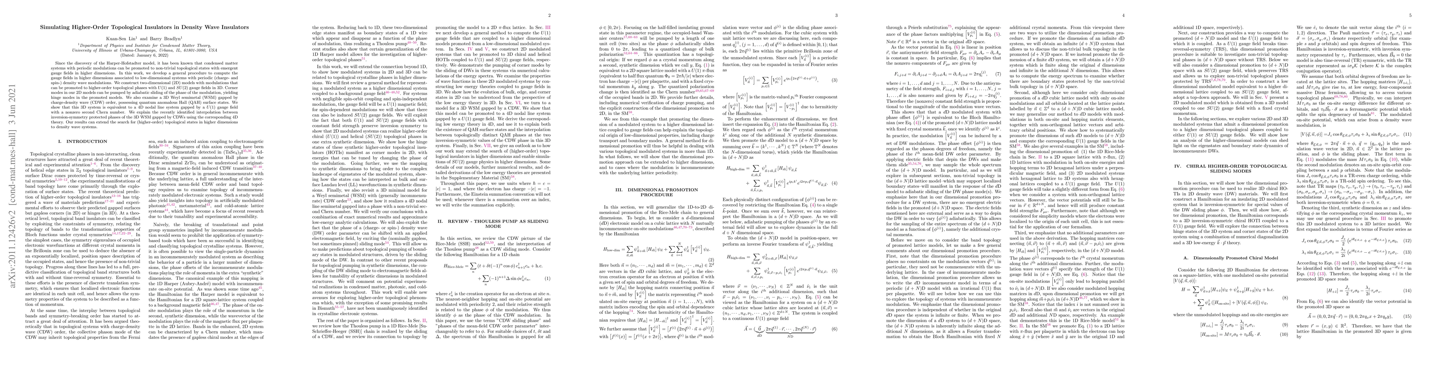 Since the discovery of the Harper-Hofstadter model, it has been known that condensed matter systems with periodic modulations can be promoted to non-trivial topological states with emergent gauge fields in higher dimensions. In this work, we develop a general procedure to compute the gauge fields in higher dimensions associated to low-dimensional systems with periodic (charge- and spin-) density wave modulations. We construct two-dimensional (2D) models with modulations that can be promoted to higher-order topological phases with $U(1)$ and $SU(2)$ gauge fields in 3D. Corner modes in our 2D models can be pumped by adiabatic sliding of the phase of the modulation, yielding hinge modes in the promoted models. We also examine a 3D Weyl semimetal (WSM) gapped by charge-density wave (CDW) order, possessing quantum anomalous Hall (QAH) surface states. We show that this 3D system is equivalent to a 4D nodal line system gapped by a $U(1)$ gauge field with a nonzero second Chern number. We explain the recently identified interpolation between inversion-symmetry protected phases of the 3D WSM gapped by CDWs using the corresponding 4D theory. Our results can extend the search for (higher-order) topological states in higher dimensions to density wave systems.