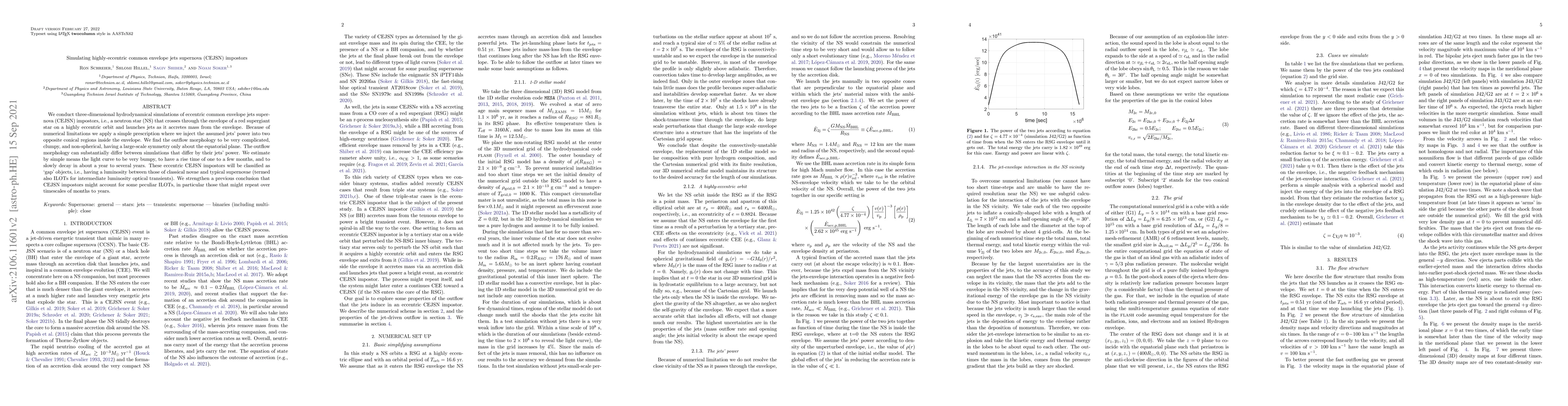 We conduct three-dimensional hydrodynamical simulations of eccentric common envelope jets supernova (CEJSN) impostors, i.e., a neutron star (NS) that crosses through the envelope of a red supergiant star on a highly eccentric orbit and launches jets as it accretes mass from the envelope. Because of numerical limitations we apply a simple prescription where we inject the assumed jets' power into two opposite conical regions inside the envelope. We find the outflow morphology to be very complicated, clumpy, and non-spherical, having a large-scale symmetry only about the equatorial plane. The outflow morphology can substantially differ between simulations that differ by their jets' power. We estimate by simple means the light curve to be very bumpy, to have a rise time of one to a few months, and to slowly decay in about a year to several years. These eccentric CEJSN impostors will be classified as `gap' objects, i.e., having a luminosity between those of classical novae and typical supernovae (termed also ILOTs for intermediate luminosity optical transients). We strengthen a previous conclusion that CEJSN impostors might account for some peculiar ILOTs, in particular those that might repeat over timescales of months to years.