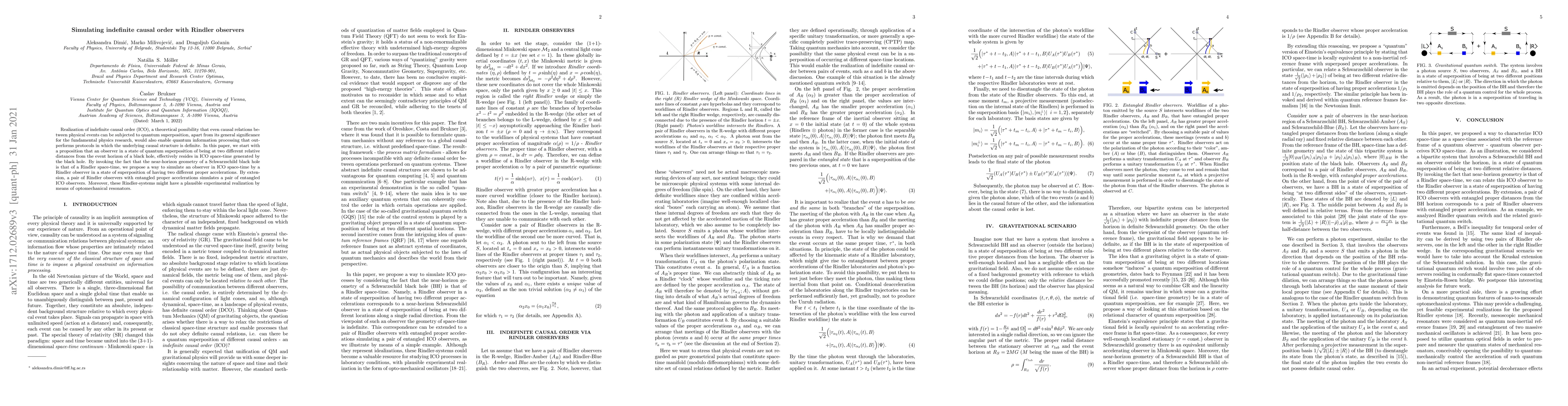 Realization of indefinite causal order (ICO), a theoretical possibility that even causal relations between physical events can be subjected to quantum superposition, apart from its general significance for the fundamental physics research, would also enable quantum information processing that outperforms protocols in which the underlying causal structure is definite. In this paper, we start with a proposition that an observer in a state of quantum superposition of being at two different relative distances from the event horizon of a black hole, effectively resides in ICO space-time generated by the black hole. By invoking the fact that the near-horizon geometry of a Schwarzschild black hole is that of a Rindler space-time, we propose a way to simulate an observer in ICO space-time by a Rindler observer in a state of superposition of having two different proper accelerations. By extension, a pair of Rindler observers with entangled proper accelerations simulates a pair of entangled ICO observers. Moreover, these Rindler-systems might have a plausible experimental realization by means of optomechanical resonators.