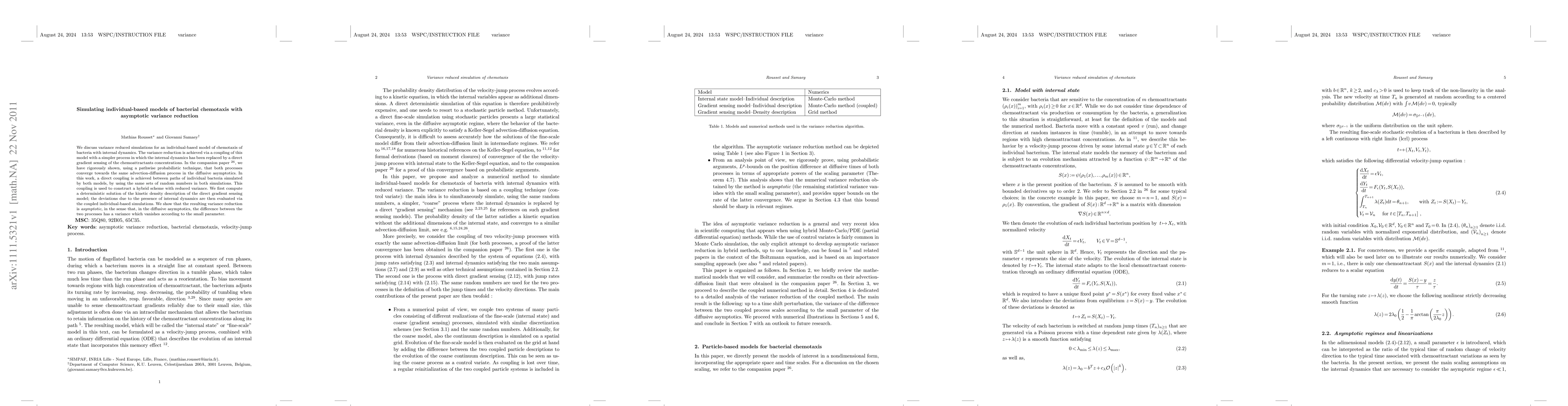 We discuss variance reduced simulations for an individual-based model of chemotaxis of bacteria with internal dynamics. The variance reduction is achieved via a coupling of this model with a simpler process in which the internal dynamics has been replaced by a direct gradient sensing of the chemoattractants concentrations. In the companion paper \cite{limits}, we have rigorously shown, using a pathwise probabilistic technique, that both processes converge towards the same advection-diffusion process in the diffusive asymptotics. In this work, a direct coupling is achieved between paths of individual bacteria simulated by both models, by using the same sets of random numbers in both simulations. This coupling is used to construct a hybrid scheme with reduced variance. We first compute a deterministic solution of the kinetic density description of the direct gradient sensing model; the deviations due to the presence of internal dynamics are then evaluated via the coupled individual-based simulations. We show that the resulting variance reduction is \emph{asymptotic}, in the sense that, in the diffusive asymptotics, the difference between the two processes has a variance which vanishes according to the small parameter.
