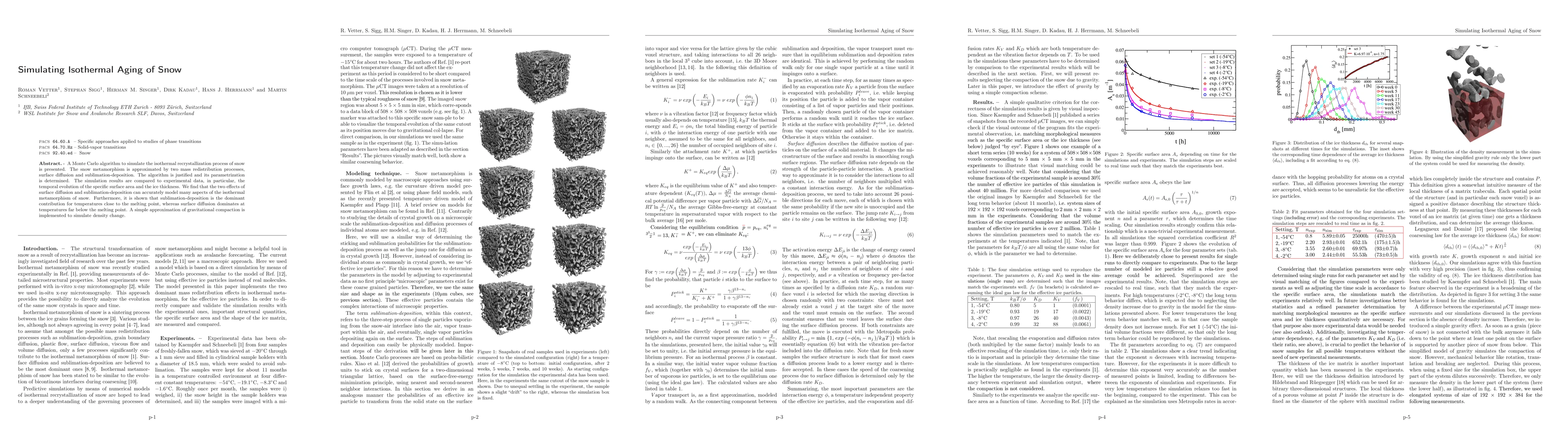 A Monte Carlo algorithm to simulate the isothermal recrystallization process of snow is presented. The snow metamorphism is approximated by two mass redistribution processes, surface diffusion and sublimation-deposition. The algorithm is justified and its parametrization is determined. The simulation results are compared to experimental data, in particular, the temporal evolution of the specific surface area and the ice thickness. We find that the two effects of surface diffusion and sublimation-deposition can accurately model many aspects of the isothermal metamorphism of snow. Furthermore, it is shown that sublimation-deposition is the dominant contribution for temperatures close to the melting point, whereas surface diffusion dominates at temperatures far below the melting point. A simple approximation of gravitational compaction is implemented to simulate density change.