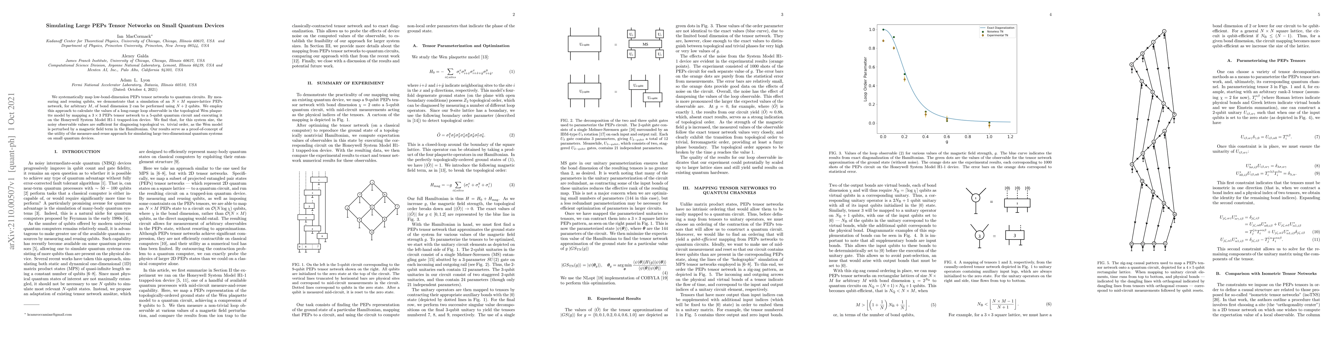 This paper demonstrates a method to simulate large PEPs tensor networks on small quantum devices by mapping them to quantum circuits, using a measure-and-reuse qubit strategy. The approach successfully simulates a $3\times 3$ PEPs network on a 5-qubit quantum device, showing its utility in diagnosing topological order in the Wen plaquette model.