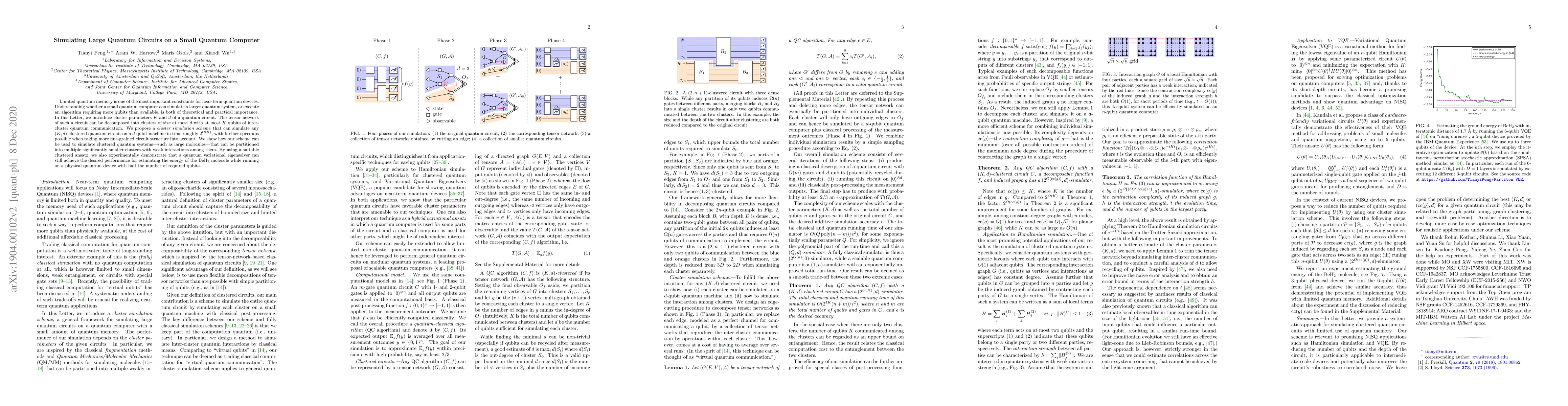 Limited quantum memory is one of the most important constraints for near-term quantum devices. Understanding whether a small quantum computer can simulate a larger quantum system, or execute an algorithm requiring more qubits than available, is both of theoretical and practical importance. In this Letter, we introduce cluster parameters $K$ and $d$ of a quantum circuit. The tensor network of such a circuit can be decomposed into clusters of size at most $d$ with at most $K$ qubits of inter-cluster quantum communication. We propose a cluster simulation scheme that can simulate any $(K,d)$-clustered quantum circuit on a $d$-qubit machine in time roughly $2^{O(K)}$, with further speedups possible when taking more fine-grained circuit structure into account. We show how our scheme can be used to simulate clustered quantum systems -- such as large molecules -- that can be partitioned into multiple significantly smaller clusters with weak interactions among them. By using a suitable clustered ansatz, we also experimentally demonstrate that a quantum variational eigensolver can still achieve the desired performance for estimating the energy of the BeH$_2$ molecule while running on a physical quantum device with half the number of required qubits.