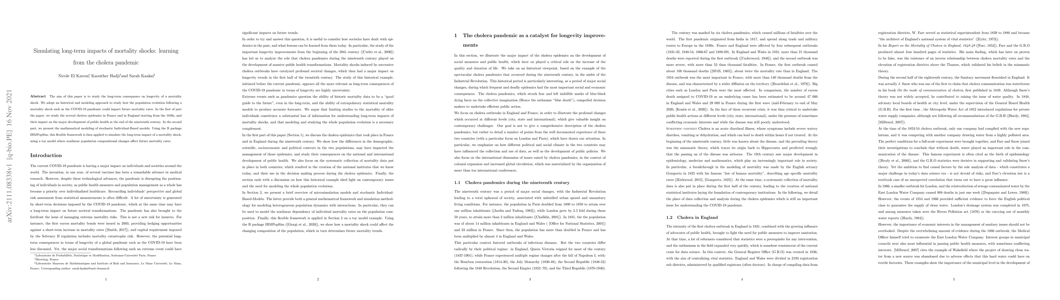 This paper examines the long-term effects of mortality shocks on population longevity through historical cholera epidemics and mathematical modeling. It analyzes historical cholera outbreaks in France and England and their influence on public health, and uses stochastic Individual-Based models to simulate the long-term impacts of such shocks on future mortality rates.