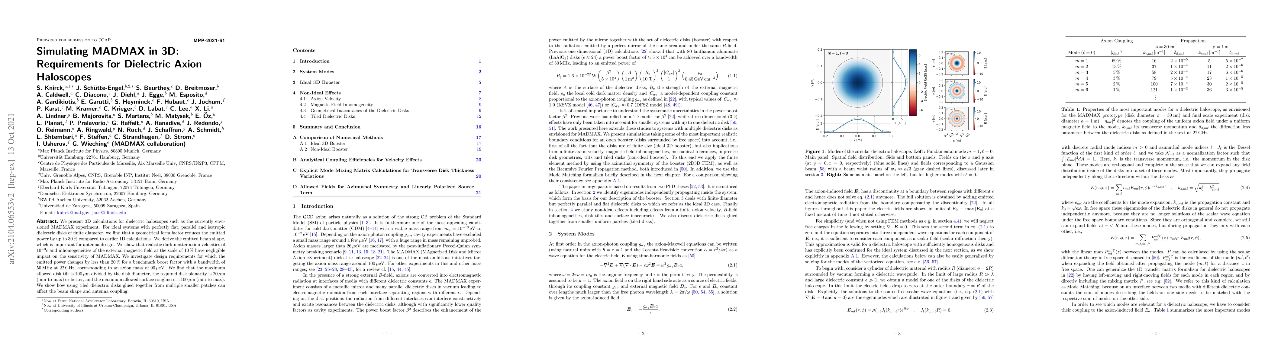 We present 3D calculations for dielectric haloscopes such as the currently envisioned MADMAX experiment. For ideal systems with perfectly flat, parallel and isotropic dielectric disks of finite diameter, we find that a geometrical form factor reduces the emitted power by up to $30\,\%$ compared to earlier 1D calculations. We derive the emitted beam shape, which is important for antenna design. We show that realistic dark matter axion velocities of $10^{-3} c$ and inhomogeneities of the external magnetic field at the scale of $10\,\%$ have negligible impact on the sensitivity of MADMAX. We investigate design requirements for which the emitted power changes by less than $20\,\%$ for a benchmark boost factor with a bandwidth of $50\,{\rm MHz}$ at $22\,{\rm GHz}$, corresponding to an axion mass of $90\,\mu{\rm eV}$. We find that the maximum allowed disk tilt is $100\,\mu{\rm m}$ divided by the disk diameter, the required disk planarity is $20\,\mu{\rm m}$ (min-to-max) or better, and the maximum allowed surface roughness is $100\,\mu{\rm m}$ (min-to-max). We show how using tiled dielectric disks glued together from multiple smaller patches can affect the beam shape and antenna coupling.
