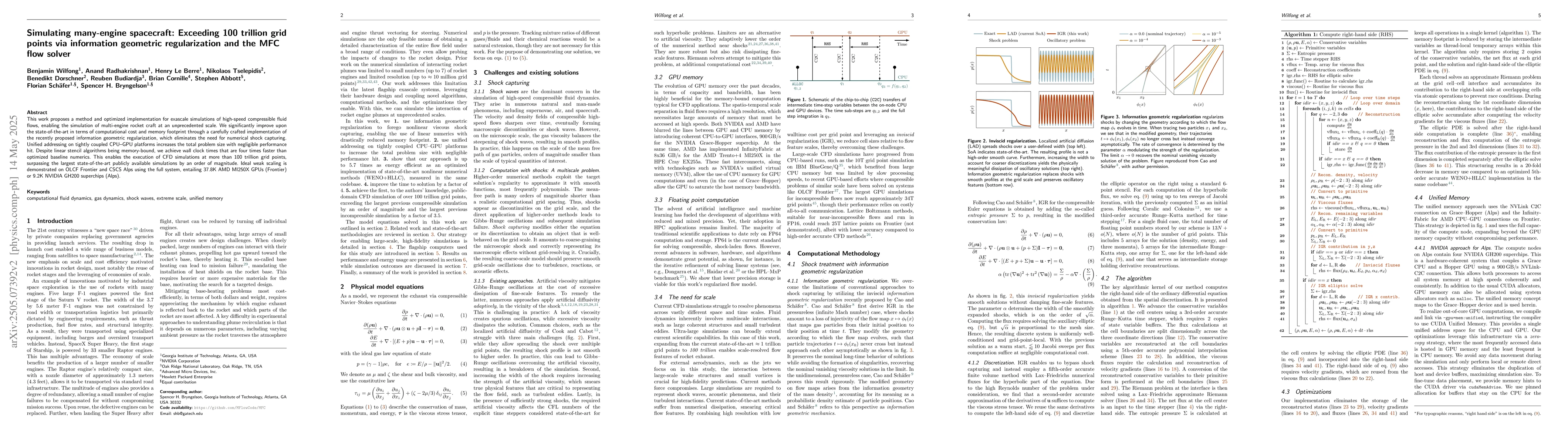 The research employs information geometric regularization and the MFC flow solver to simulate high-speed compressible fluid flows, specifically for multi-engine rocket craft, on tightly coupled CPU-GPU platforms.