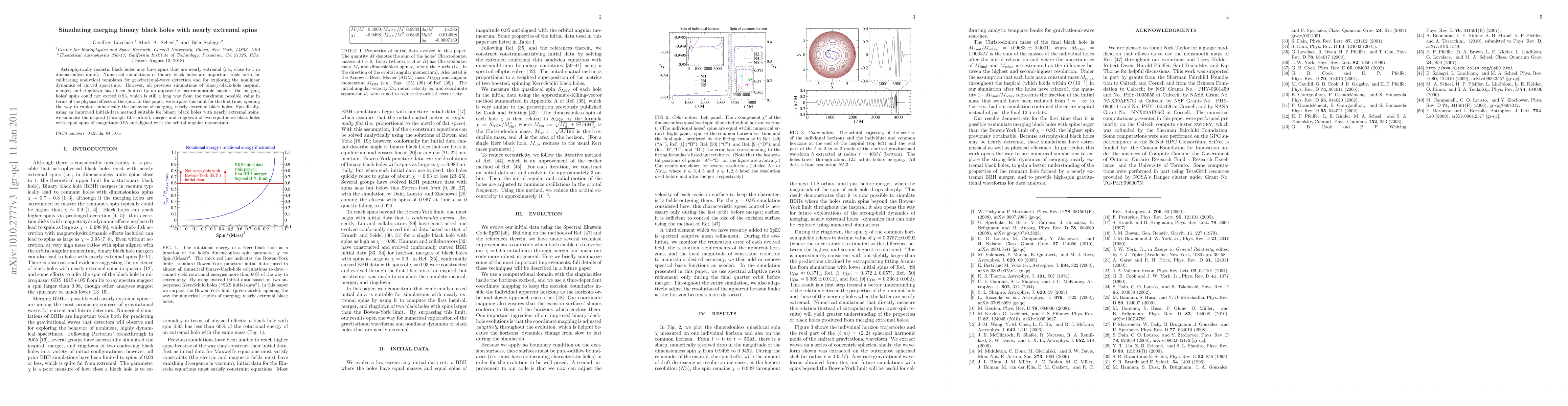 This paper presents the first numerical simulations of merging binary black holes with spins nearly reaching the extremal value of 1, overcoming previous limitations that capped spins at 0.93. The study explores the inspiral, merger, and ringdown of two equal-mass black holes with spins of 0.95, using an improved initial-data method.