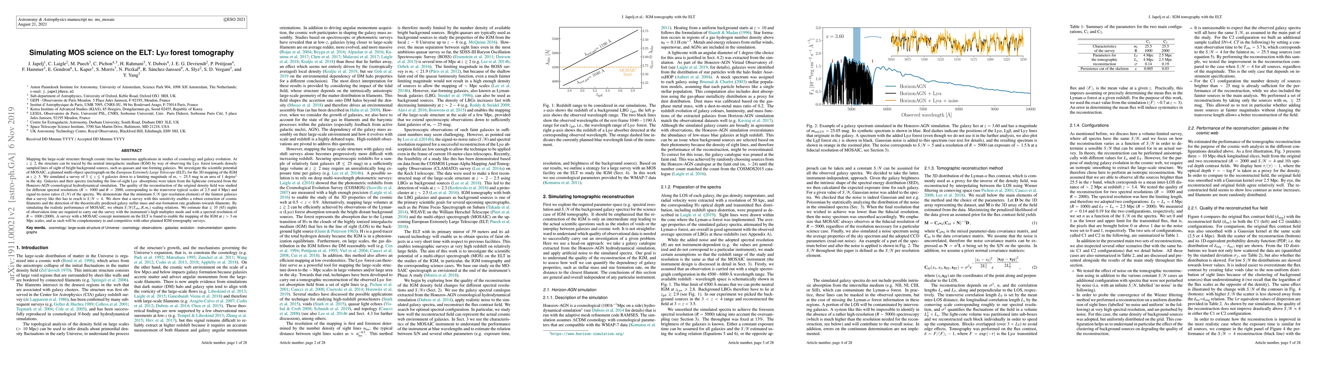 This research simulates the use of MOSAIC, a future ELT instrument, for 3D mapping of the intergalactic medium (IGM) at z ~ 3-4. The study uses data from the Horizon-AGN simulation, finding that a survey of faint galaxies with S/N > 4 can robustly reconstruct density fields, reveal filamentary structures, and detect gradients in galaxy properties. Approximately 35-65 nights of ELT observation time are estimated for this survey, demonstrating MOSAIC's potential for large-scale IGM tomography at high redshifts.