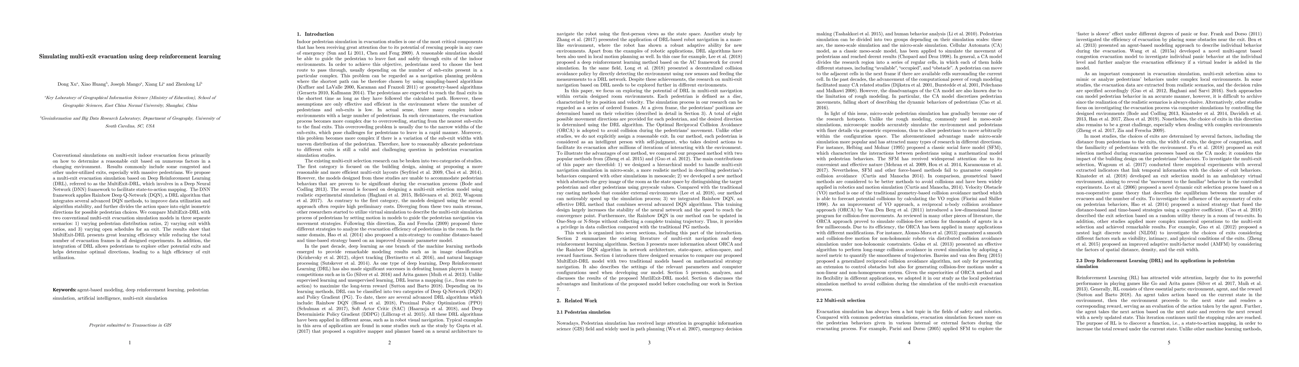 This paper proposes a Deep Reinforcement Learning (DRL) model, MultiExit-DRL, to simulate multi-exit indoor evacuations, using a Deep Neural Network (DNN) and Rainbow DQN to improve efficiency and reduce congestion. Compared to conventional models, MultiExit-DRL shows better learning efficiency and optimal exit utilization across various scenarios.