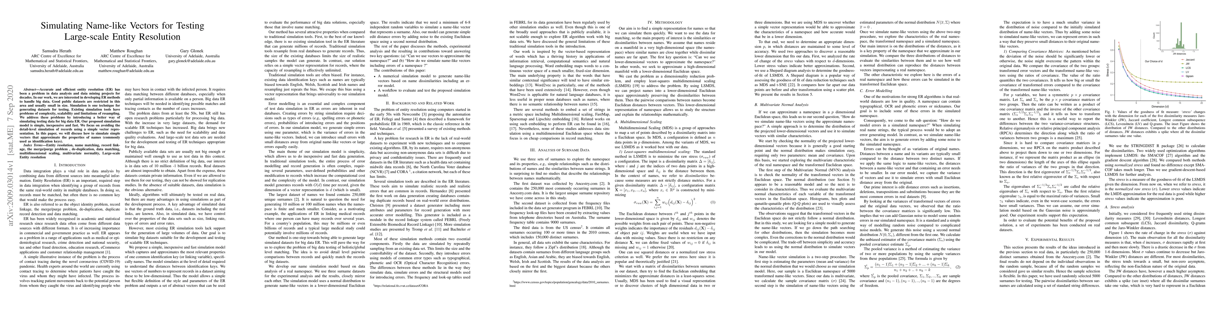 Accurate and efficient entity resolution (ER) has been a problem in data analysis and data mining projects for decades. In our work, we are interested in developing ER methods to handle big data. Good public datasets are restricted in this area and usually small in size. Simulation is one technique for generating datasets for testing. Existing simulation tools have problems of complexity, scalability and limitations of resampling. We address these problems by introducing a better way of simulating testing data for big data ER. Our proposed simulation model is simple, inexpensive and fast. We focus on avoiding the detail-level simulation of records using a simple vector representation. In this paper, we will discuss how to simulate simple vectors that approximate the properties of names (commonly used as identification keys).