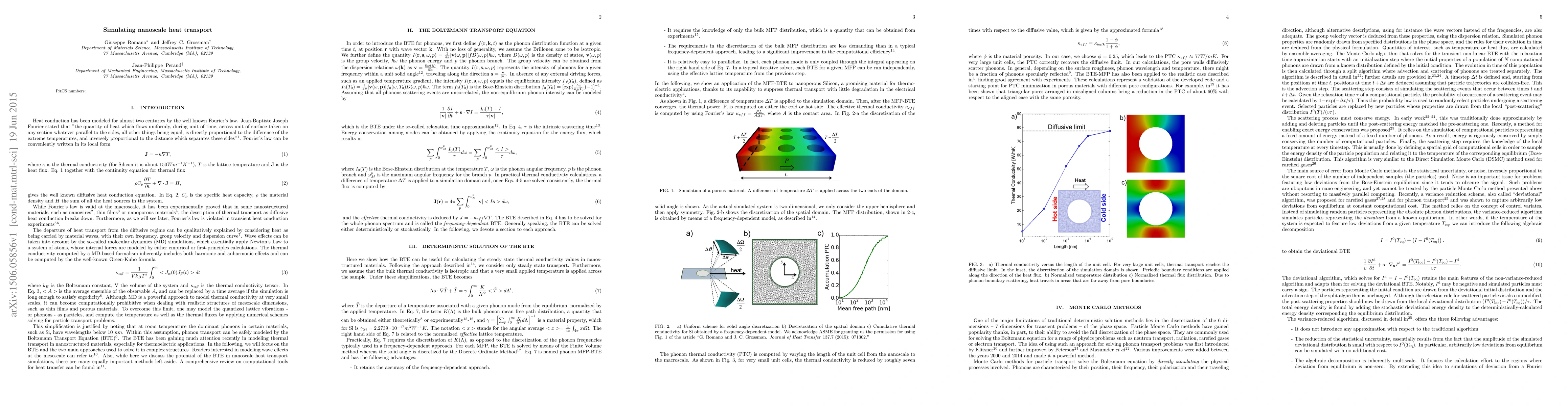 This chapter outlines the simulation of nanoscale heat transport, emphasizing non-Fourier heat conduction through phonon scattering. It reviews numerical techniques for solving the Boltzmann Transport Equation, including deterministic and Monte Carlo methods, and concludes with a discussion on the importance of multiscale modeling.