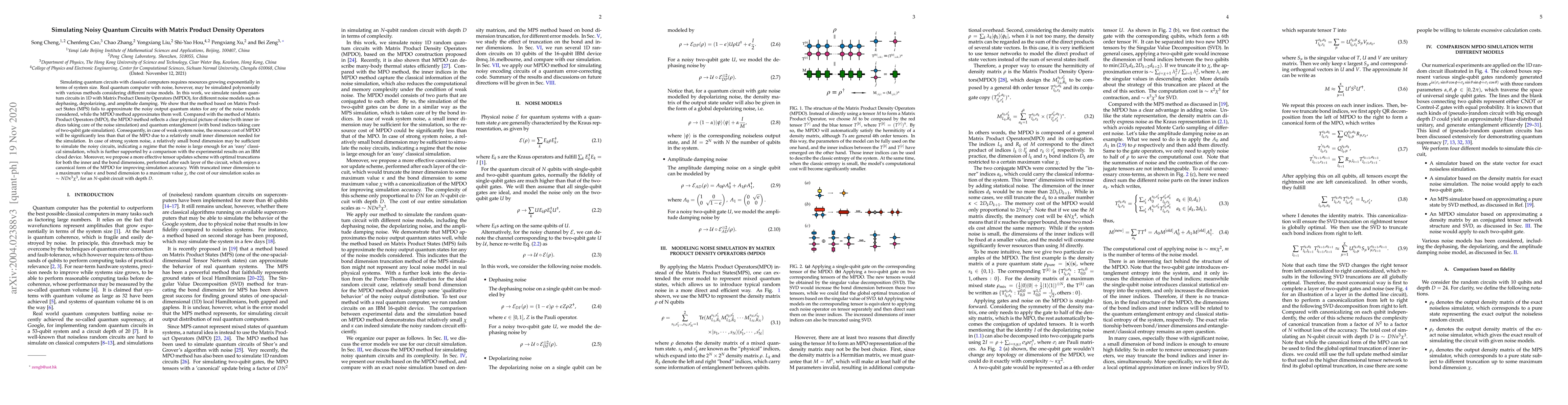 Simulating quantum circuits with classical computers requires resources growing exponentially in terms of system size. Real quantum computer with noise, however, may be simulated polynomially with various methods considering different noise models. In this work, we simulate random quantum circuits in 1D with Matrix Product Density Operators (MPDO), for different noise models such as dephasing, depolarizing, and amplitude damping. We show that the method based on Matrix Product States (MPS) fails to approximate the noisy output quantum states for any of the noise models considered, while the MPDO method approximates them well. Compared with the method of Matrix Product Operators (MPO), the MPDO method reflects a clear physical picture of noise (with inner indices taking care of the noise simulation) and quantum entanglement (with bond indices taking care of two-qubit gate simulation). Consequently, in case of weak system noise, the resource cost of MPDO will be significantly less than that of the MPO due to a relatively small inner dimension needed for the simulation. In case of strong system noise, a relatively small bond dimension may be sufficient to simulate the noisy circuits, indicating a regime that the noise is large enough for an `easy' classical simulation. Moreover, we propose a more effective tensor updates scheme with optimal truncations for both the inner and the bond dimensions, performed after each layer of the circuit, which enjoys a canonical form of the MPDO for improving simulation accuracy. With truncated inner dimension to a maximum value $\kappa$ and bond dimension to a maximum value $\chi$, the cost of our simulation scales as $\sim ND\kappa^3\chi^3$, for an $N$-qubit circuit with depth $D$.