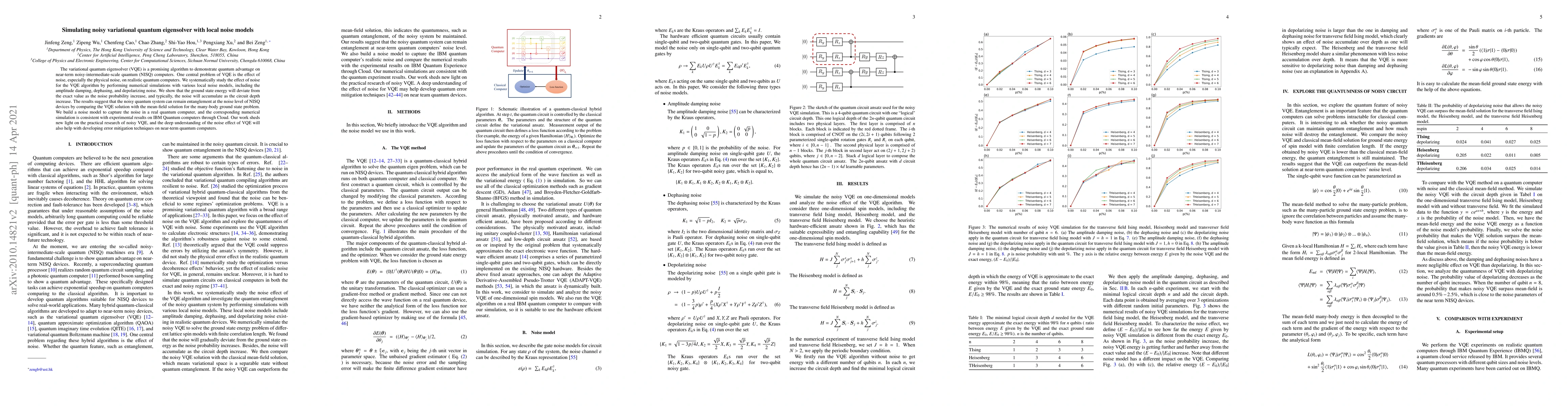 Variational quantum eigensolver (VQE) is promising to show quantum advantage on near-term noisy-intermediate-scale quantum (NISQ) computers. One central problem of VQE is the effect of noise, especially the physical noise on realistic quantum computers. We study systematically the effect of noise for the VQE algorithm, by performing numerical simulations with various local noise models, including the amplitude damping, dephasing, and depolarizing noise. We show that the ground state energy will deviate from the exact value as the noise probability increase and normally noise will accumulate as the circuit depth increase. We build a noise model to capture the noise in a real quantum computer. Our numerical simulation is consistent with the quantum experiment results on IBM Quantum computers through Cloud. Our work sheds new light on the practical research of noisy VQE. The deep understanding of the noise effect of VQE may help to develop quantum error mitigation techniques on near team quantum computers.