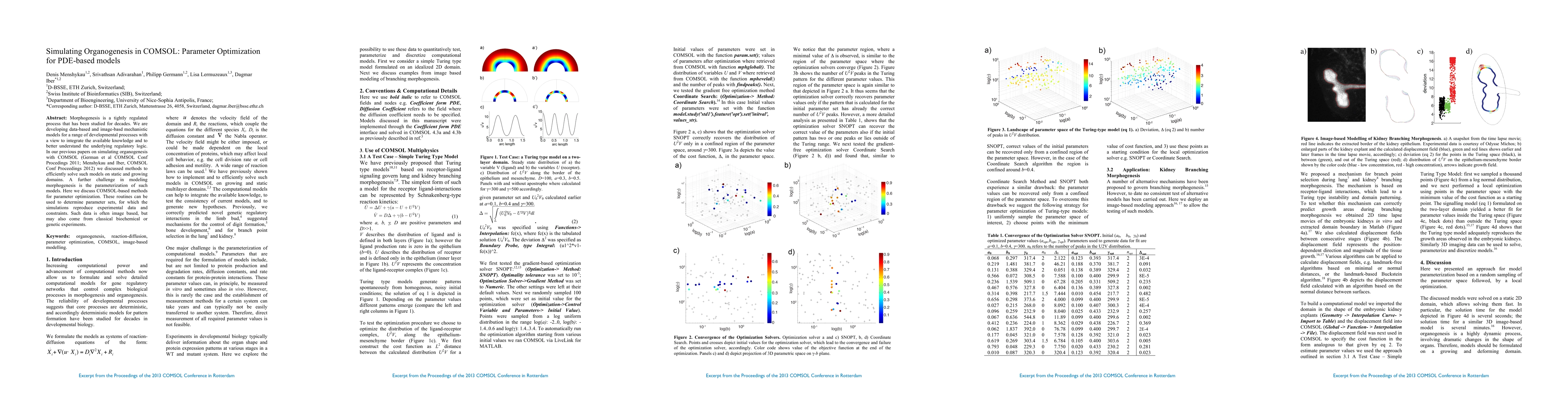 This paper discusses methods for parameter optimization in COMSOL to simulate organogenesis using PDE-based models. The authors focus on developing data-driven and image-based mechanistic models to understand developmental processes, emphasizing the importance of accurately determining parameter values to match experimental data.