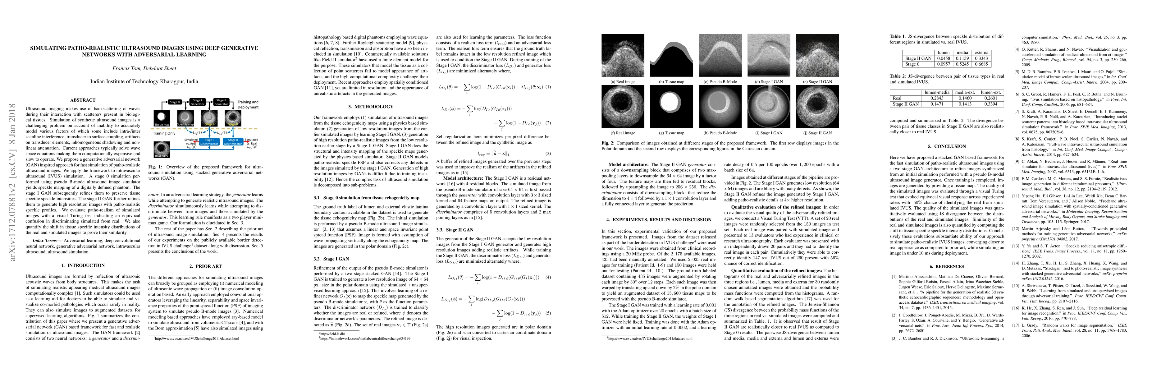 Ultrasound imaging makes use of backscattering of waves during their interaction with scatterers present in biological tissues. Simulation of synthetic ultrasound images is a challenging problem on account of inability to accurately model various factors of which some include intra-/inter scanline interference, transducer to surface coupling, artifacts on transducer elements, inhomogeneous shadowing and nonlinear attenuation. Current approaches typically solve wave space equations making them computationally expensive and slow to operate. We propose a generative adversarial network (GAN) inspired approach for fast simulation of patho-realistic ultrasound images. We apply the framework to intravascular ultrasound (IVUS) simulation. A stage 0 simulation performed using pseudo B-mode ultrasound image simulator yields speckle mapping of a digitally defined phantom. The stage I GAN subsequently refines them to preserve tissue specific speckle intensities. The stage II GAN further refines them to generate high resolution images with patho-realistic speckle profiles. We evaluate patho-realism of simulated images with a visual Turing test indicating an equivocal confusion in discriminating simulated from real. We also quantify the shift in tissue specific intensity distributions of the real and simulated images to prove their similarity.