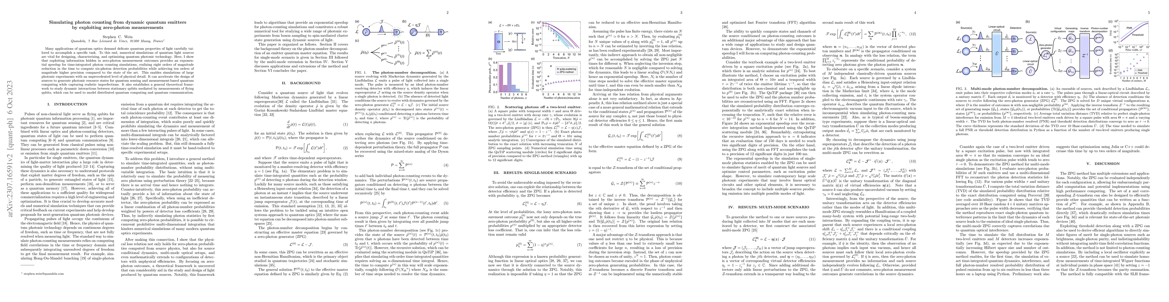 This paper presents a novel method for exponentially speeding up simulations of photon counting from dynamic quantum emitters by leveraging zero-photon measurement outcomes, achieving an eight-order-of-magnitude reduction in computation time and ten-order-of-magnitude higher precision compared to existing methods. This advancement facilitates the design of quantum photonic technologies and establishes a theoretical framework for studying dynamic quantum interactions.