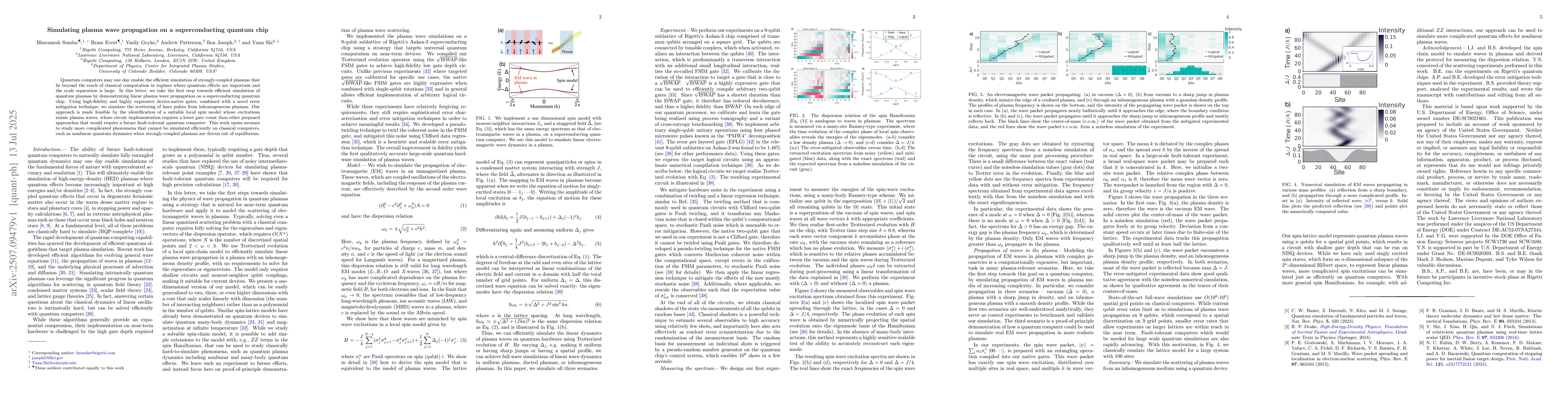 Quantum computers may one day enable the efficient simulation of strongly-coupled plasmas that lie beyond the reach of classical computation in regimes where quantum effects are important and the scale separation is large. In this letter, we take the first step towards efficient simulation of quantum plasmas by demonstrating linear plasma wave propagation on a superconducting quantum chip. Using high-fidelity and highly expressive device-native gates, combined with a novel error mitigation technique, we simulate the scattering of laser pulses from inhomogeneous plasmas. Our approach is made feasible by the identification of a suitable local spin model whose excitations mimic plasma waves, whose circuit implementation requires a lower gate count than other proposed approaches that would require a future fault-tolerant quantum computer. This work opens avenues to study more complicated phenomena that cannot be simulated efficiently on classical computers, such as nonlinear quantum dynamics when strongly-coupled plasmas are driven out of equilibrium.