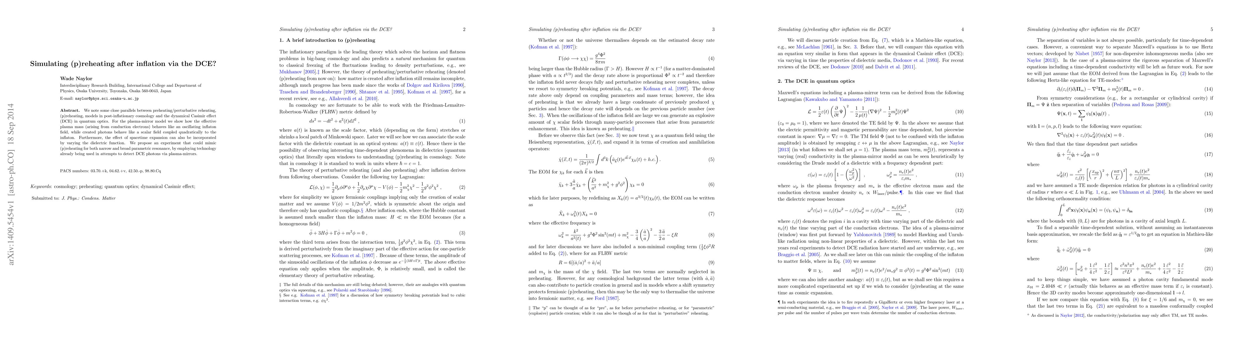 We note some close parallels between preheating/perturbative reheating, (p)reheating, models in post-inflationary cosmology and the dynamical Casimir effect (DCE) in quantum optics. For the plasma-mirror model we show how the effective plasma mass (arising from conduction electrons) behaves like an oscillating inflaton field, while created photons behave like a scalar field coupled quadratically to the inflaton. Furthermore, the effect of spacetime expansion can also be incorporated by varying the dielectric function. We propose an experiment that could mimic (p)reheating for both narrow and broad parametric resonance, by employing technology already being used in attempts to detect DCE photons via plasma-mirrors.