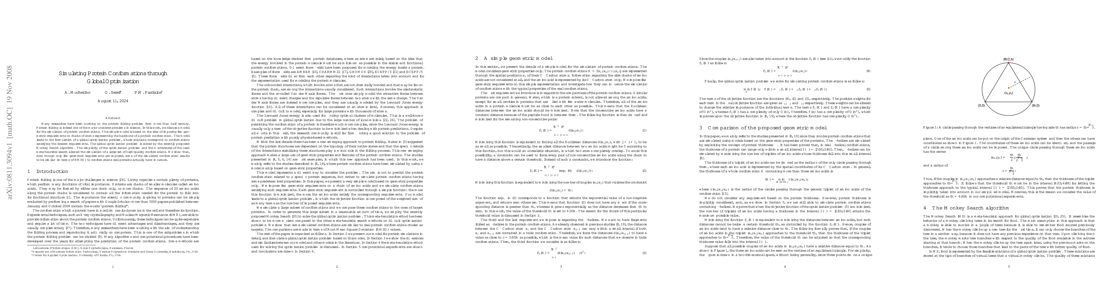 This research presents a global optimization model for simulating protein conformations based on geometric requirements. It utilizes the Monkey Search algorithm to solve the optimization problem, successfully generating high-quality conformations that resemble natural protein structures.