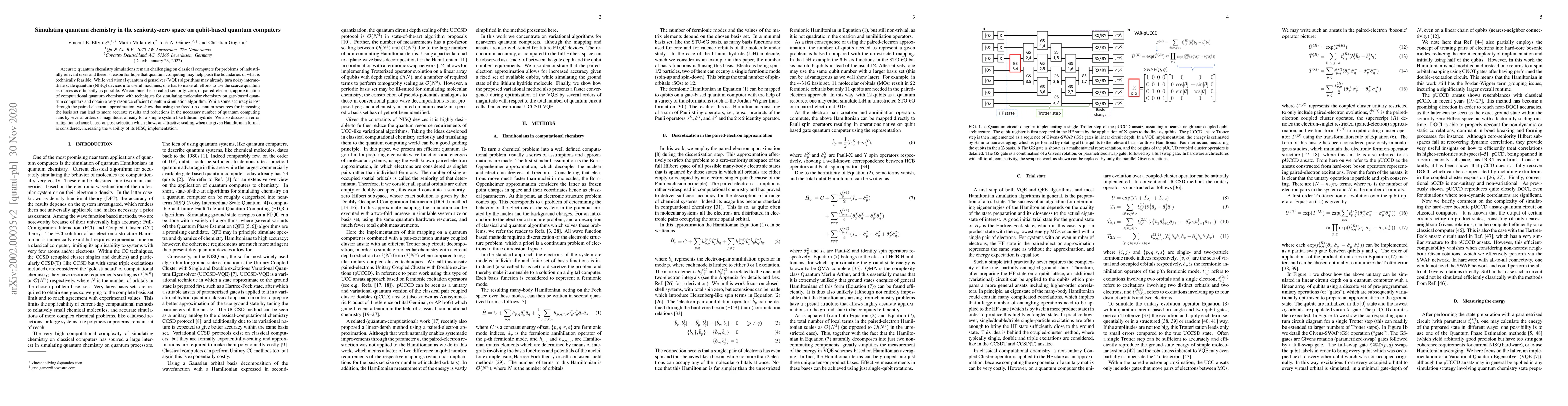 Accurate quantum chemistry simulations remain challenging on classical computers for problems of industrially relevant sizes and there is reason for hope that quantum computing may help push the boundaries of what is technically feasible. While variational quantum eigensolver (VQE) algorithms may already turn noisy intermediate scale quantum (NISQ) devices into useful machines, one has to make all efforts to use the scarce quantum resources as efficiently as possible. We combine the so-called seniority-zero, or paired-electron, approximation of computational quantum chemistry with techniques for simulating molecular chemistry on gate-based quantum computers and obtain a very resource efficient quantum simulation algorithm. While some accuracy is lost through the paired-electron approximation, we show that using the freed-up quantum resources for increasing the basis set can lead to more accurate results and reductions in the necessary number of quantum computing runs by several orders of magnitude, already for a simple system like lithium hydride. We also discuss an error mitigation scheme based on post-selection which shows an attractive scaling when the given Hamiltonian format is considered, increasing the viability of its NISQ implementation.