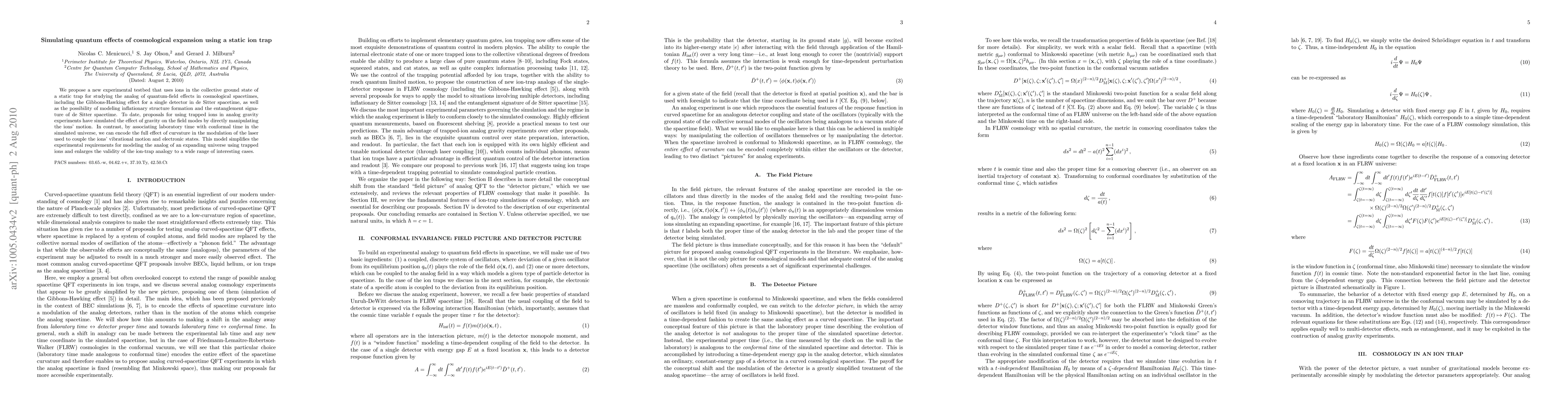 We propose a new experimental testbed that uses ions in the collective ground state of a static trap for studying the analog of quantum-field effects in cosmological spacetimes, including the Gibbons-Hawking effect for a single detector in de Sitter spacetime, as well as the possibility of modeling inflationary structure formation and the entanglement signature of de Sitter spacetime. To date, proposals for using trapped ions in analog gravity experiments have simulated the effect of gravity on the field modes by directly manipulating the ions' motion. In contrast, by associating laboratory time with conformal time in the simulated universe, we can encode the full effect of curvature in the modulation of the laser used to couple the ions' vibrational motion and electronic states. This model simplifies the experimental requirements for modeling the analog of an expanding universe using trapped ions and enlarges the validity of the ion-trap analogy to a wide range of interesting cases.
