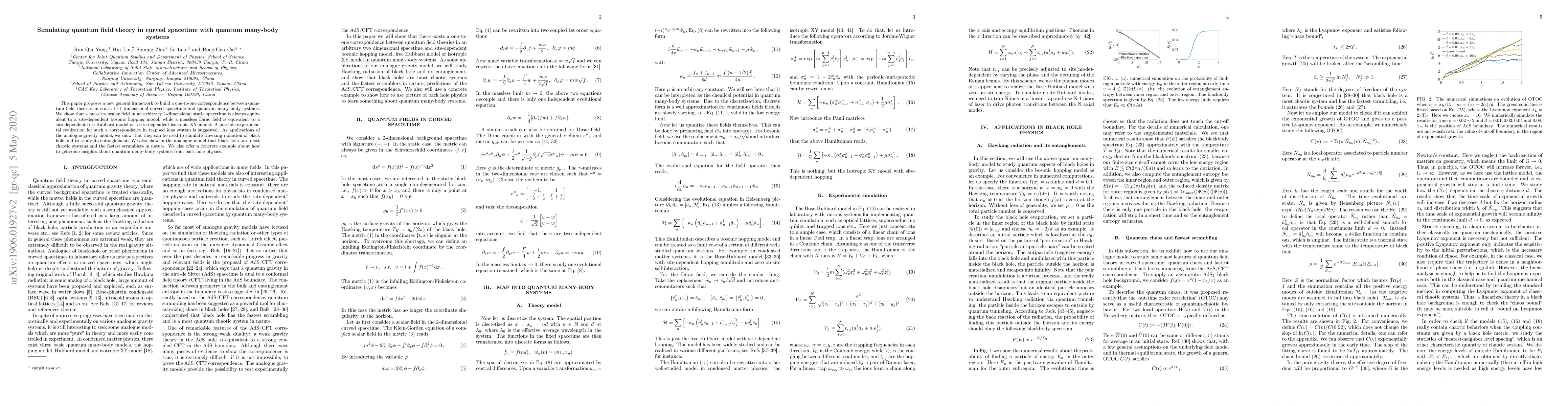 This paper establishes a framework linking quantum field theories in curved spacetime to quantum many-body systems, demonstrating equivalences between scalar and Dirac fields and their respective models. It suggests trapped ions as a potential experimental setup and explores applications like simulating Hawking radiation and studying black hole chaos and entanglement.