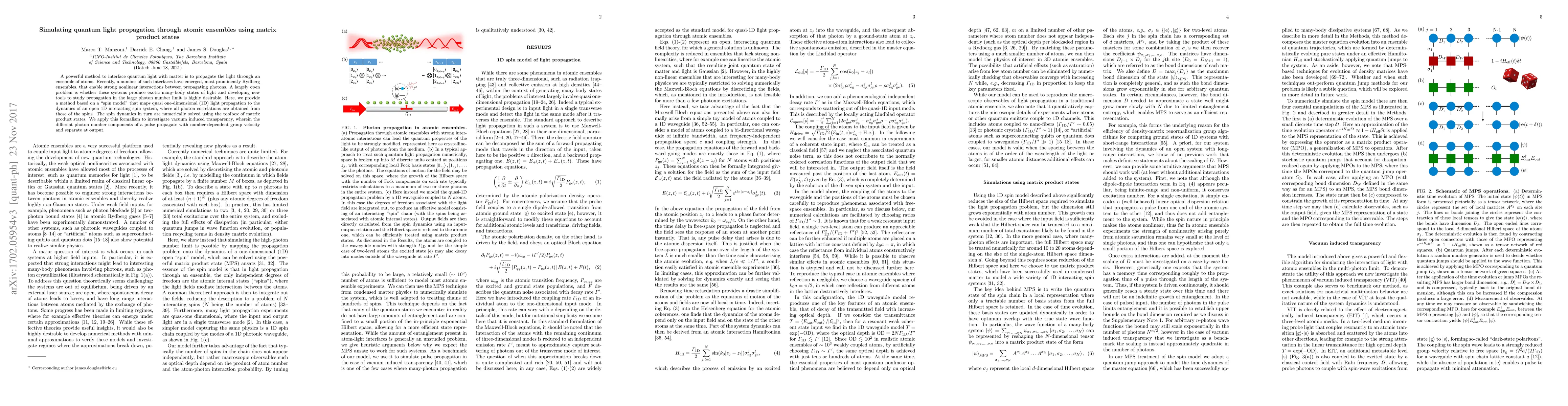 This paper introduces a method to simulate quantum light propagation through atomic ensembles using matrix product states, mapping quasi-one-dimensional light dynamics to an open 1D spin system. The approach is applied to study vacuum induced transparency, revealing number-dependent group velocities of different photon components.