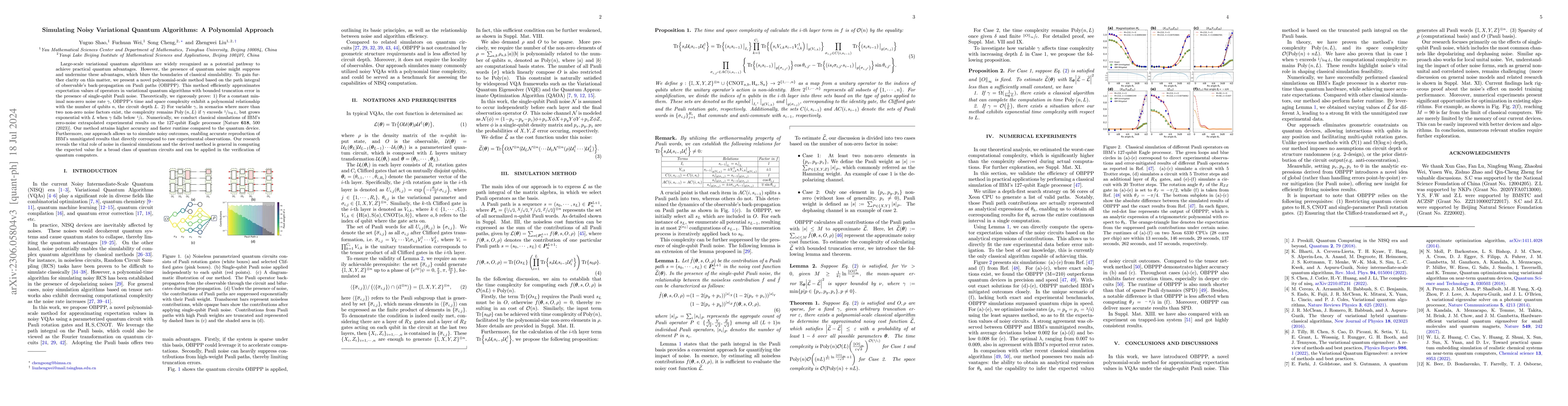 This paper introduces a polynomial-scale method, OBPPP, to simulate quantum mean values in noisy variational quantum algorithms, achieving higher accuracy and faster runtime than direct quantum device simulations. The method's complexity is polynomial for high noise rates and exponential for low noise rates, providing insights into the practical quantum advantage under noise.