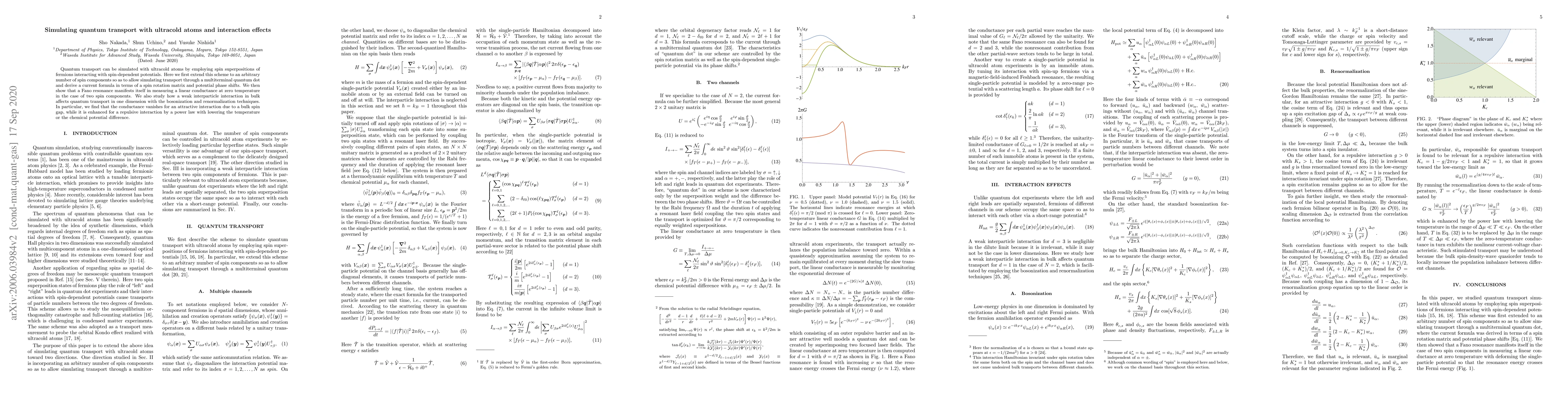 Quantum transport can be simulated with ultracold atoms by employing spin superpositions of fermions interacting with spin-dependent potentials. Here we first extend this scheme to an arbitrary number of spin components so as to allow simulating transport through a multiterminal quantum dot and derive a current formula in terms of a spin rotation matrix and potential phase shifts. We then show that a Fano resonance manifests itself in measuring a linear conductance at zero temperature in the case of two spin components. We also study how a weak interparticle interaction in bulk affects quantum transport in one dimension with the bosonization and renormalization techniques. In particular, we find that the conductance vanishes for an attractive interaction due to a bulk spin gap, while it is enhanced for a repulsive interaction by a power law with lowering the temperature or the chemical potential difference.