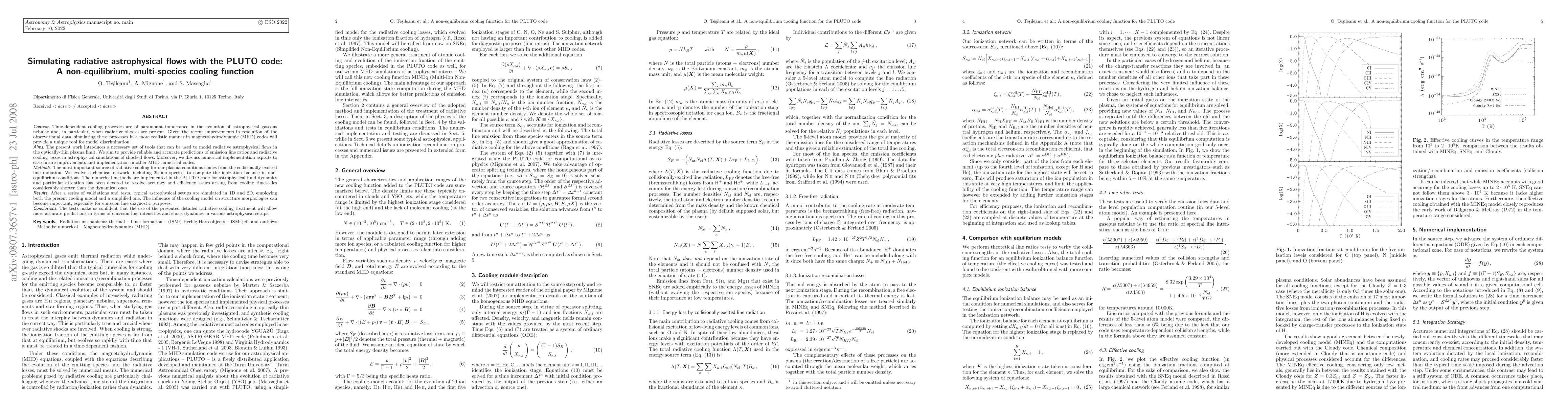 This paper introduces a sophisticated non-equilibrium, multi-species cooling function for simulating radiative astrophysical flows using the PLUTO code, focusing on optically-thin plasmas and radiative shocks. It emphasizes the importance of accurate emission line ratios and cooling losses, validated through 1D and 2D simulations, and discusses numerical implementation for future enhancements.