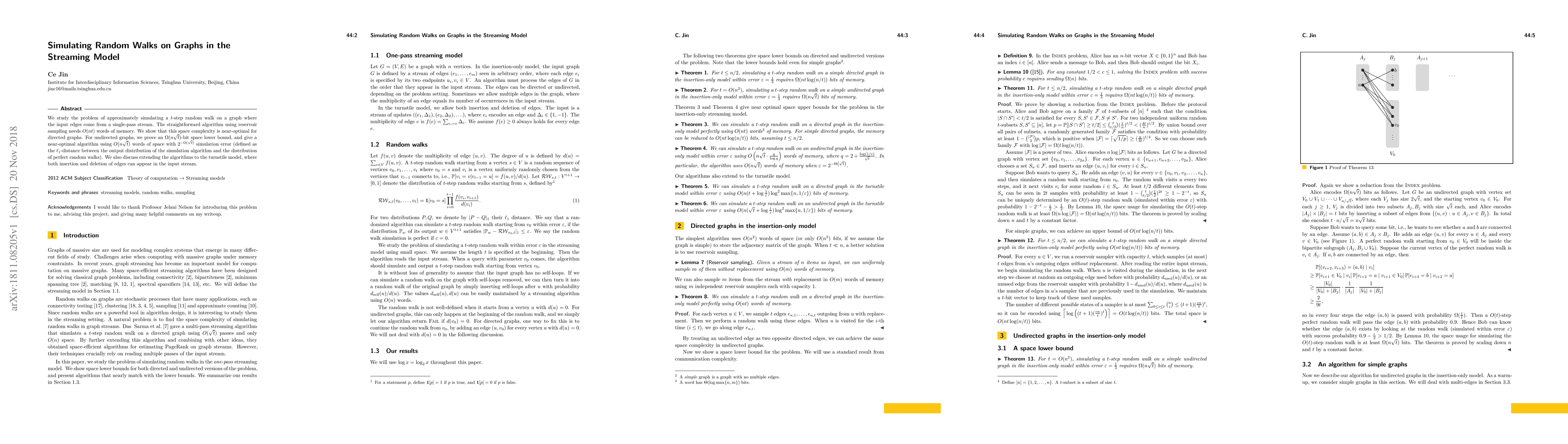 The paper studies the problem of simulating a t-step random walk on a graph in the streaming model, where edges are processed in a single pass. It proposes algorithms for both directed and undirected graphs, analyzing their space complexity and simulation error.