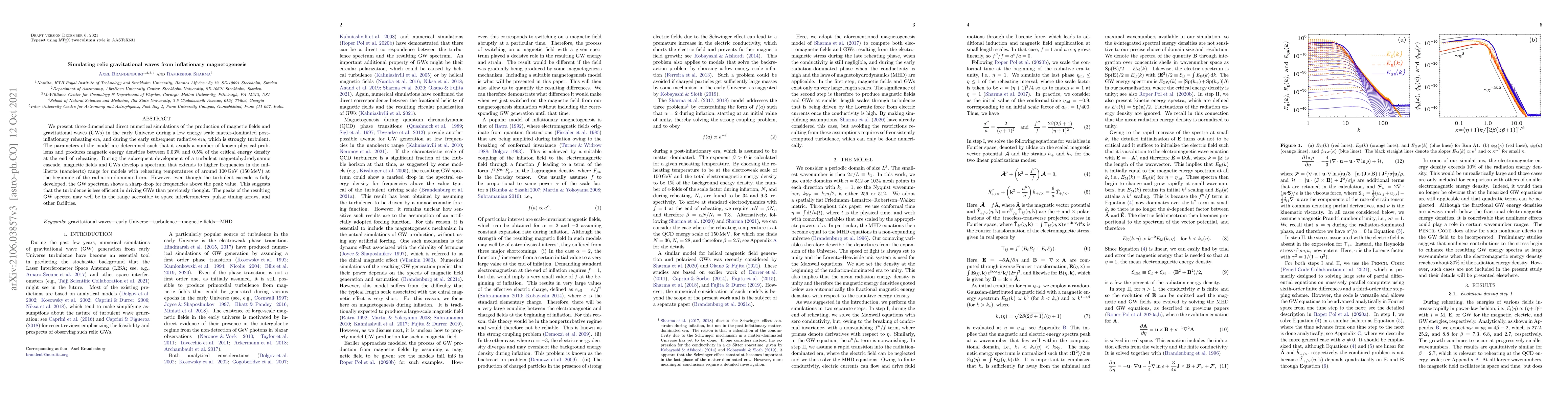 We present three-dimensional direct numerical simulations of the production of magnetic fields and gravitational waves (GWs) in the early Universe during a low energy scale matter-dominated post-inflationary reheating era, and during the early subsequent radiative era, which is strongly turbulent. The parameters of the model are determined such that it avoids a number of known physical problems and produces magnetic energy densities between 0.2% and 2% of the critical energy density at the end of reheating. During the subsequent development of a turbulent magnetohydrodynamic cascade, magnetic fields and GWs develop a spectrum that extends to higher frequencies in the millihertz (nanohertz) range for models with reheating temperatures of around 100 GeV (150 MeV) at the beginning of the radiation-dominated era. However, even though the turbulent cascade is fully developed, the GW spectrum shows a sharp drop for frequencies above the peak value. This suggests that the turbulence is less efficient in driving GWs than previously thought. The peaks of the resulting GW spectra may well be in the range accessible to space interferometers, pulsar timing arrays, and other facilities.