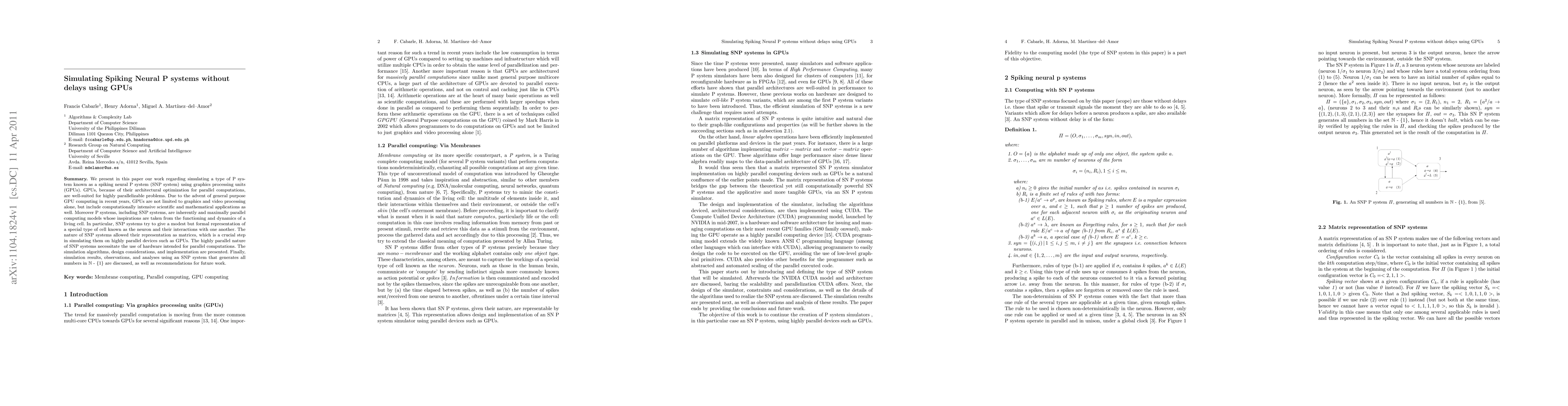 This paper explores the simulation of spiking neural P systems (SNP systems) on GPUs, leveraging their parallel computation capabilities. The authors present algorithms and implementation details, demonstrating the effectiveness of GPUs for this highly parallel task, and discuss future directions based on simulation results.