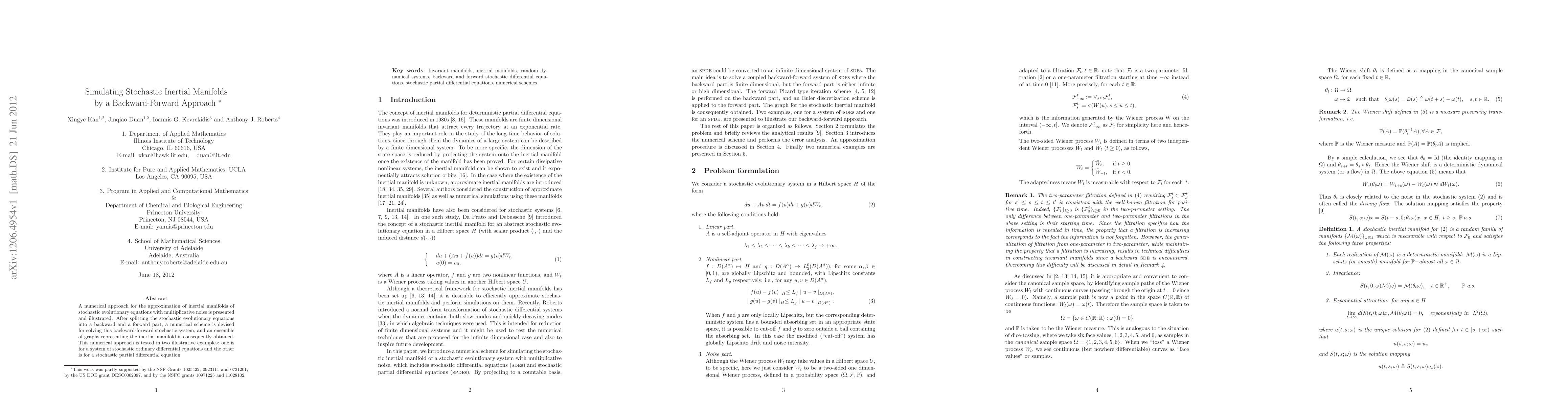 A numerical approach for the approximation of inertial manifolds of stochastic evolutionary equations with multiplicative noise is presented and illustrated. After splitting the stochastic evolutionary equations into a backward and a forward part, a numerical scheme is devised for solving this backward-forward stochastic system, and an ensemble of graphs representing the inertial manifold is consequently obtained. This numerical approach is tested in two illustrative examples: one is for a system of stochastic ordinary differential equations and the other is for a stochastic partial differential equation.