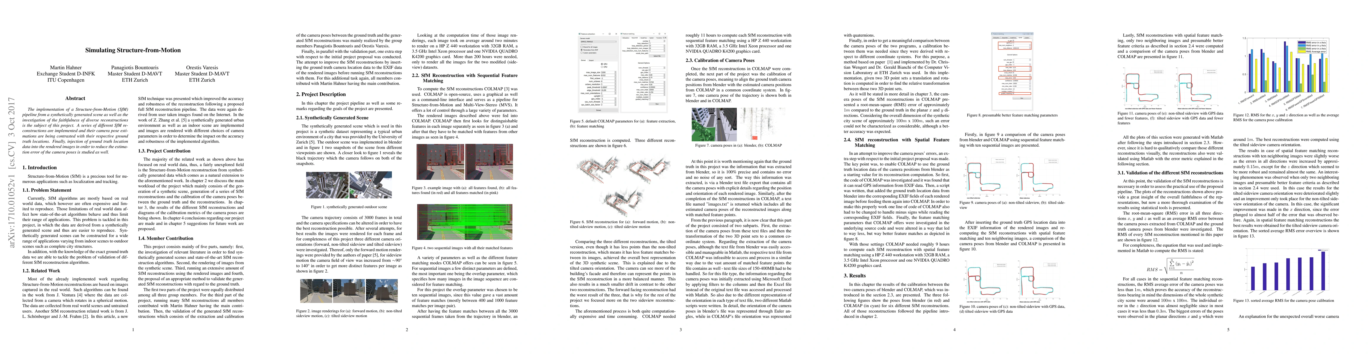 The implementation of a Structure-from-Motion (SfM) pipeline from a synthetically generated scene as well as the investigation of the faithfulness of diverse reconstructions is the subject of this project. A series of different SfM reconstructions are implemented and their camera pose estimations are being contrasted with their respective ground truth locations. Finally, injection of ground truth location data into the rendered images in order to reduce the estimation error of the camera poses is studied as well.
