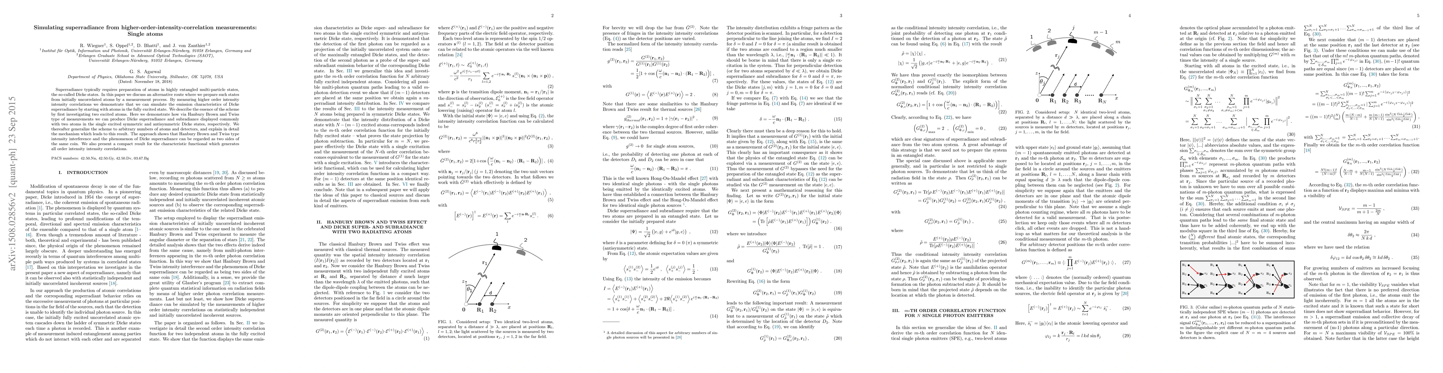 This paper proposes an alternative method to simulate superradiance by measuring higher-order intensity correlations, demonstrating that Dicke superradiance can emerge from initially uncorrelated atoms through a measurement process. The authors show that Hanbury Brown and Twiss type measurements can produce Dicke superradiance and subradiance, and generalize the scheme to any number of atoms.